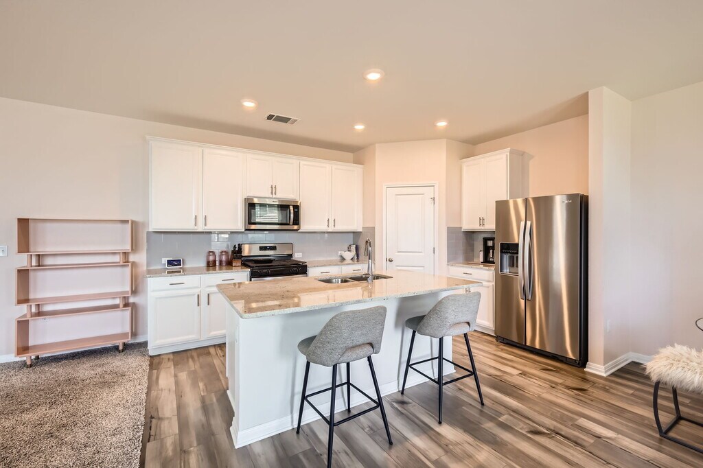 Come see this lightly lived-in, move-in ready Meritage home built in 2023. The community, called Turners Crossing, features a nice pool/playground/ community area, all just a short walk away. This very popular floor plan makes excellent use of its 2029 square feet. The home includes a large open concept kitchen and living room area that transition to a covered patio in the beautiful backyard—all perfect for relaxing and entertaining. Downstairs there’s a half bathroom and a double wide garage with plenty of extra space for storage. With a tankless water heater you’ll always have hot water, and with energy efficient double pane windows you can count on energy savings. Upstairs you’ll find four bedrooms, all with great natural light and large closets. The second level features a flex space with space for a sofa and tv. The washer/dryer closet is large with a shelf above for storage. Blinds have been installed throughout the home, and a two camera security system is set up, allowing the next owner to simply move in and enjoy this special home. Conveniently located just 10-15 minutes from HEB, restaurants, cafes, and local schools, this home has it all. (Owner is open to customizing paint color)