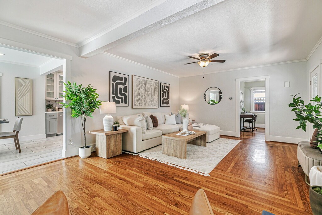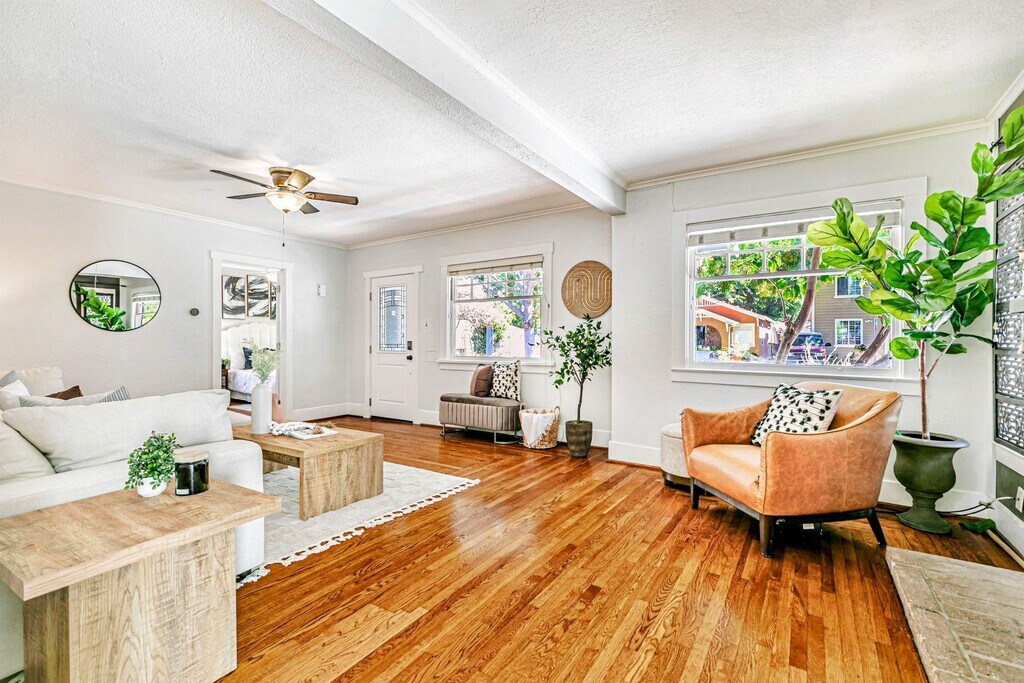 This charming single level home was built in 1935 and remodeled in 2019 with new plumbing, furnace, water heater, electrical and solar. The rental space is a 2 bedroom 2 bathroom with laundry room, storage and a full size kitchen. There is a new storage shed in the backyard coming before you move in! The private yard is large with new bark and lots of fruit trees. There are two tandem parking spots with EV charging. There is a Tesla power wall so its rare to run out of power. The dining room (you can see in the photo) has a barn door that locks on both sides that is the primary suite and will be locked off and rented to another tenant with their own private yard, own laundry and no shared bedroom walls.