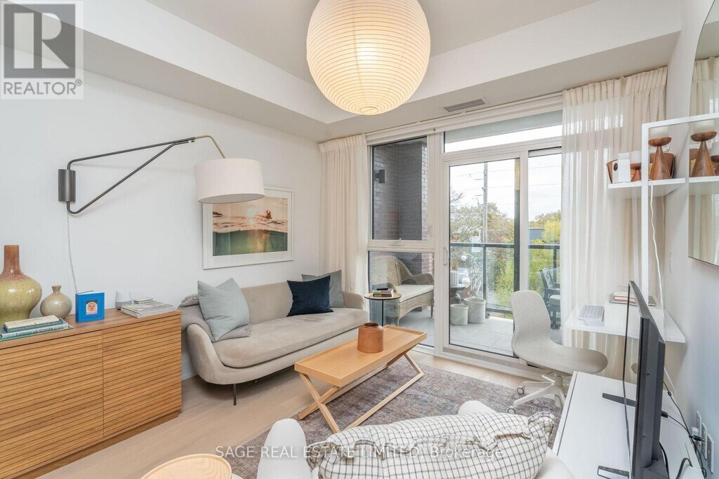 Welcome to unit 404 at The George located in the heart of Leslieville. This 1 bed,1 bath unit has been completely upgraded with all the right choices. This Modern design features an open-concept living area and a functional layout that wastes no space. Enjoy your galley kitchen with full-height white shaker cabinets,gas stove,quartz counters,full-size appliances,backsplash,under cabinet lighting,pantry & cabinet dividers over the fridge. Relax in your spa-like bathroom with heated floors,a deep soaker tub & upgraded vanity with pullout drawers. Gorgeous hardwood floors throughout,high ceilings,roller blinds,large walk-in closet in primary and a beautiful terrace with Napoleon gas BBQ,porcelain tile floor & glass railings. *Photos From Previous Listing.* (id:52069) ID#: 1924722