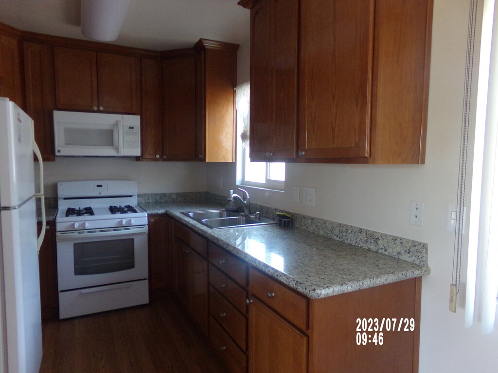 Redecorated 1 bedroom with new kitchen cabinets, fridge, stove and microwave. Copper plumbing throughout. Granite kitchen countertops. Approximately 600 square feet. Upper unit with laminate hardwood floors. Freshly painted. New double glazed windows. Ceiling fans and window air conditioning. Laundry room on premises. Assigned covered parking for one. Small pet OK with pet deposit. 12-month lease required. Close to Ventura Blvd and Fashion Square. 13564 Rye Street, Sherman Oaks. Close to Moorpark and Woodman.