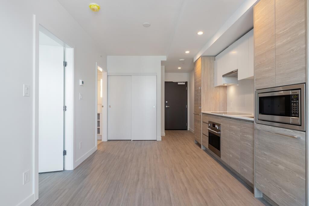 This HUB Two 443sf 1 bedroom condo has a huge 85sf balcony spanning two-thirds the width of the condo,which can be accessed from both the living room and the bedroom. Through the foyer,you enter directly into the open living-dining room with laminate floors,a coat closet,and sleek gallery kitchen. The kitchen features quartz countertops,porcelain backsplash,Bosch integrated fridge,Blomberg integrated dishwasher,Fulgor oven and Bosch induction cooktop. The 4 pcs bathroom comes with large format porcelain floor tiles,quartz countertop,soaker tub w/ large-format porcelain apron,frameless glass shower enclosure,and dual-flush toilet. Rent includes 1 parking stall. (id:52069) ID#: 1601977