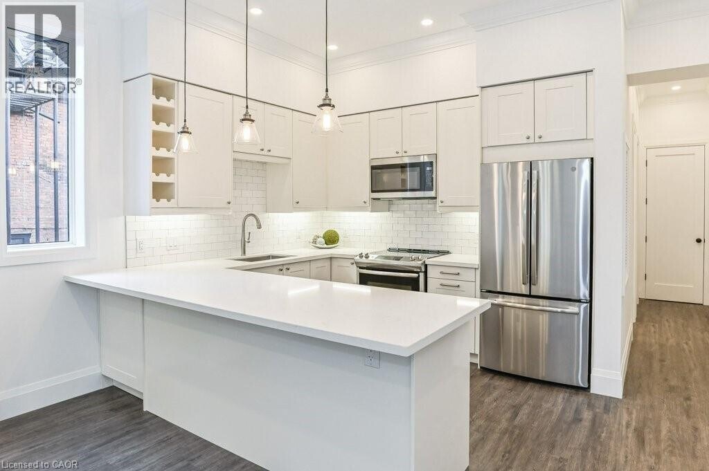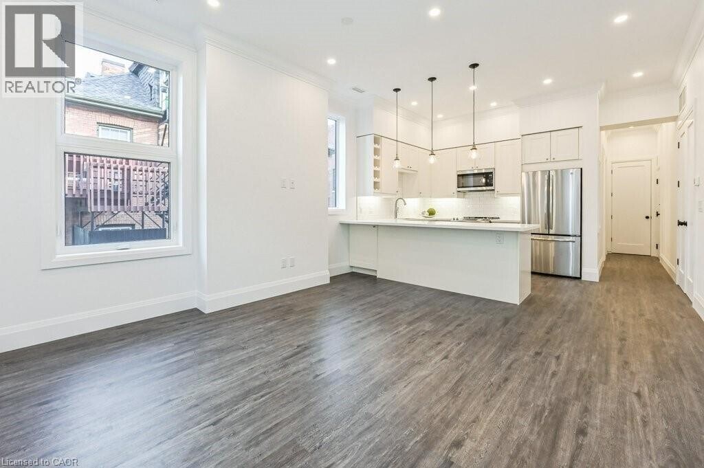 One of six amazing custom units in a fully rebuilt century building. Bright,spacious 1 bed unit steps to Downtown James street,Harbour West and Hunter Street GO,St Josephs Hospital. This main floor unit faces west providing great light in the open concept living space with bright windows,soaring ceilings and gallery sized walls. An efficient kitchen with breakfast bar,wine rack,stainless appliances,stone counters and a rustic subway backsplash has room to move and seating to entertain. Durable wood look laminate floors throughout are cozy and neutral for any decor. The bedroom will fit a king sized bed and has a large double door closet with custom built ins. The spa bath features a double vanity with stone counter,marble look floors with in floor heat,and luxe shower head combo. This unit features 2 additional storage cupboards,in suite laundry,LED potlights and crown moulding throughout,custom window coverings,in unit furnace/ac. Water included. Onsite parking included. (id:52069) ID#: 1958775