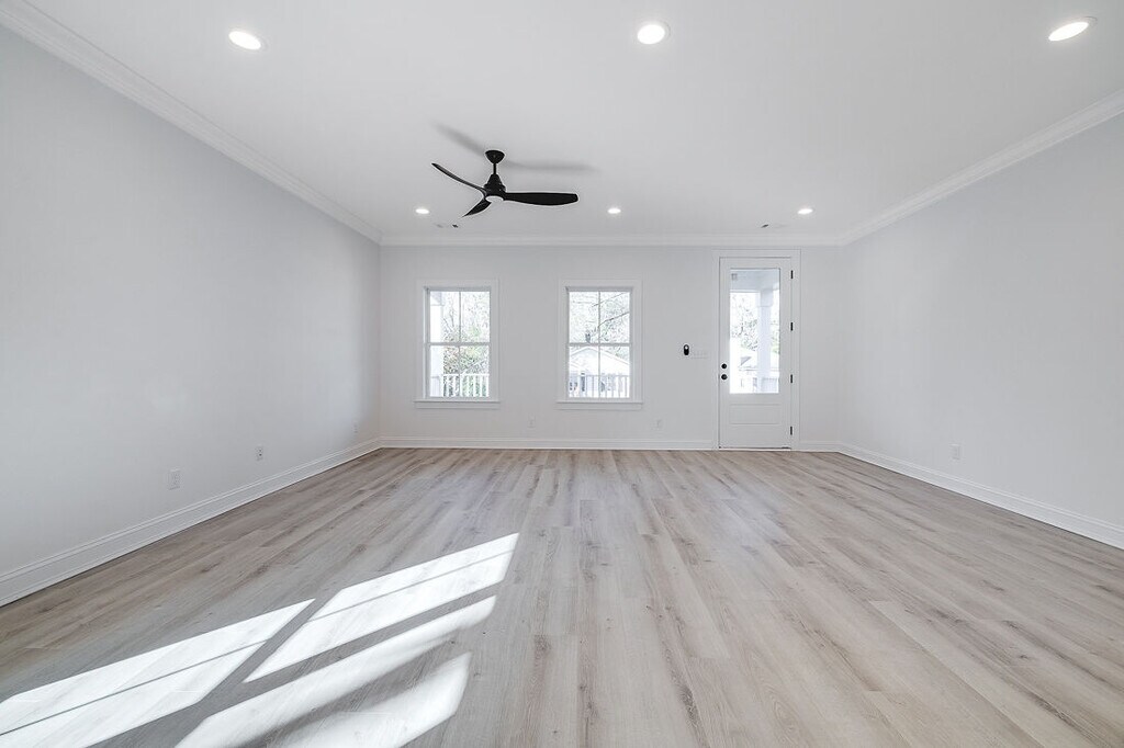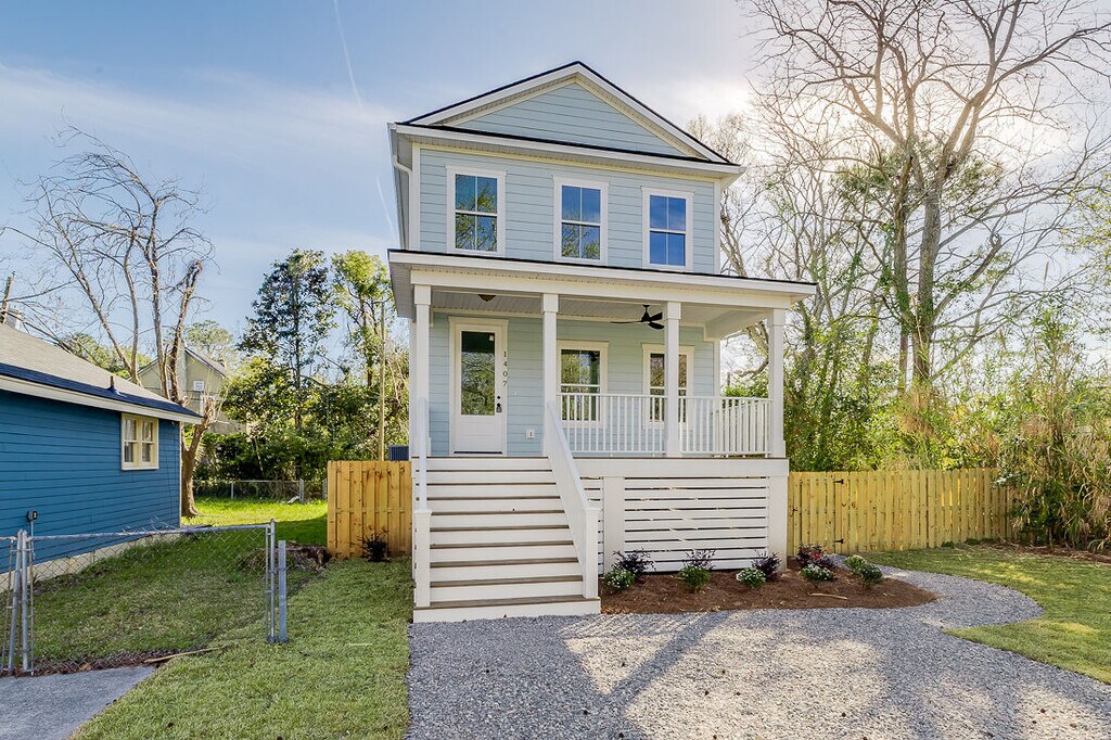 New Construction on Double Lot; modern & spacious living sits on a desirable double lot & features an open floorplan with high ceilings, offering an abundance of natural light & a sense of spaciousness throughout. The home boasts low-maintenance wood flooring, elegant quartz countertops, & upgraded moldings for a refined touch. The heart of the home is the kitchen, equipped with an eat-at island & generous walk-in pantry that provides ample storage space. Modern contemporary light fixtures enhance the home’s sleek design, while the owner’s suite offers a true retreat with a built-in walk-in closet & luxurious glass shower designed for two. With off-ground construction & spray foam insulation, this home is energy-efficient, ensuring comfort year-round. Enjoy outdoor living with both a covered front porch & covered back porch, perfect for relaxation and back yard has privacy fence.