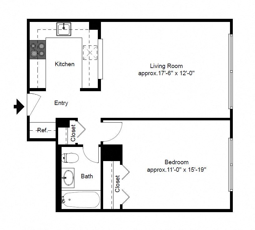 Apartment Model: One Bedroom One BathroomFrom $2,7751 Bedroom, 1 Bath, 625-629 sq ftAvailable NowFloor plans are artist's rendering. All dimensions are approximate. Actual product and specifications may vary in dimension or detail. Not all features are available in every rental home. Please see a representative for details.