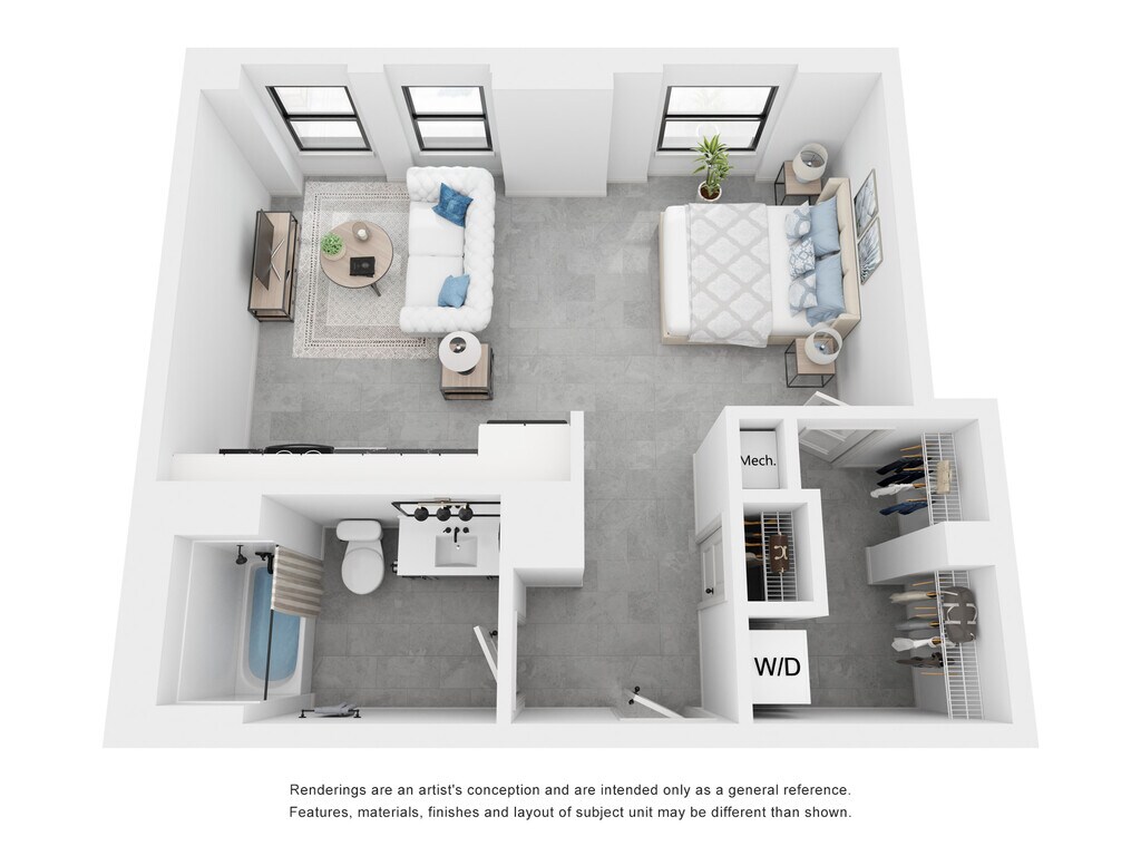 Armstrong - Floorplan 2 Apartment Unit: 402Apartment Model: Armstrong$1,419Studio, 1 Bath, 606 sq ftAvailable January 9, 2026Clara