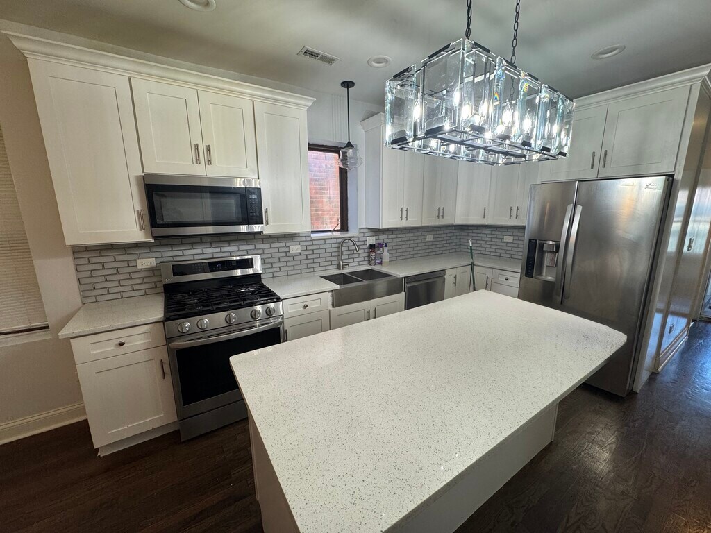 Step into this freshly painted, open-concept 3 bedroom apartment perfectly situated on the main floor with a lovely park right across the street. The kitchen is a true showstopper, featuring bright white cabinets, a sparkling quartz island countertop, and an elegant chandelier that adds a touch of sophistication. All major appliances are included refrigerator, stove, microwave, and dishwasher making move-in a breeze. Enjoy the convenience of being just minutes from both I-290 and I-55, giving you easy access to downtown and beyond. Modern comfort, style, and location all come together here ready for you to call home!