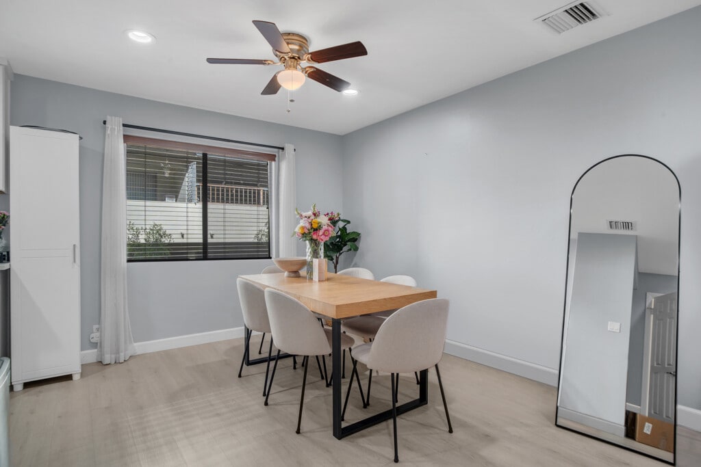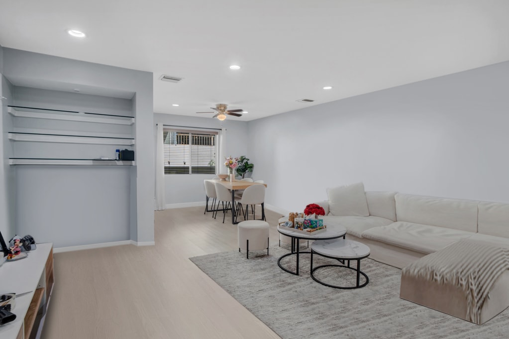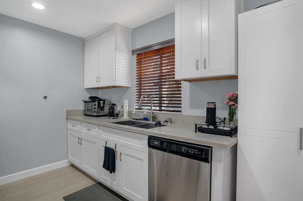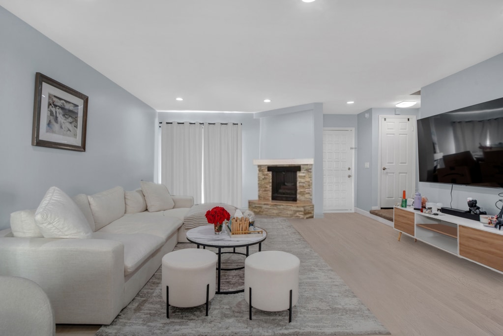 This beautifully updated townhome in a boutique 5-unit complex offers the perfect blend of style, comfort, and convenience with a thoughtful layout. The first floor welcomes you with an open-concept living and dining area featuring elegant laminate flooring, recessed lighting and fireplace. Sliding glass doors open to a private patio perfect for indoor-outdoor entertaining. The remodeled kitchen is a chef's dream with shaker-style soft-close cabinets and drawers, quartz countertops, a double sink with modern faucet, and stainless steel appliances including a gas stove, built-in microwave, and dishwasher. A stylish half bath completes the main level, ideal for guests. Upstairs, the spacious primary suite boasts vaulted ceilings, two large double closets, an inviting alcove perfect for a home office or reading nook, and access to the balcony. The full bathroom offers a separate tub and shower, granite-topped vanity, generous cabinetry, and an additional double closet. A full-size stackable washer and dryer and a linen closet are conveniently located just outside the primary suite. Additional features include two assigned tandem gated parking spaces, two storage cabinets, and access to a community patio with BBQ area. HOA dues cover earthquake insurance, water, sewer, and building hot water. Ideally located near the Van Nuys/Sherman Oaks Recreation Center with tennis courts, athletic fields, and a pool. Just minutes from Trader Joe's, Westfield Fashion Square, and the vibrant restaurants and nightlife of Ventura Blvd with easy access to the 101 and 405 freeways.This turnkey townhome has it all style, space, and a location that can't be beat! ALSO OFFERED FOR SALE!