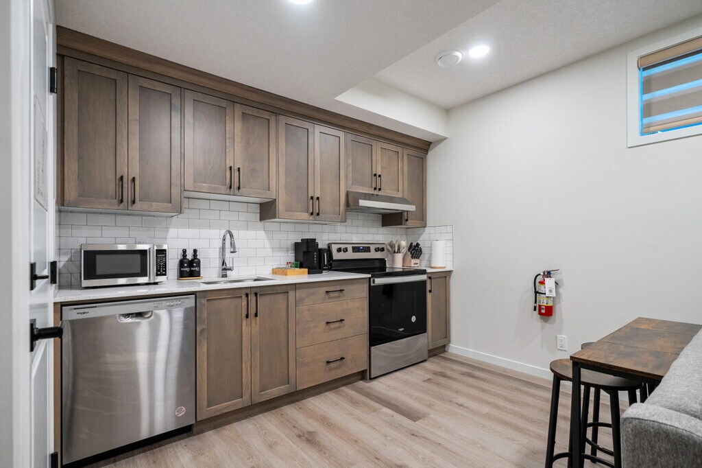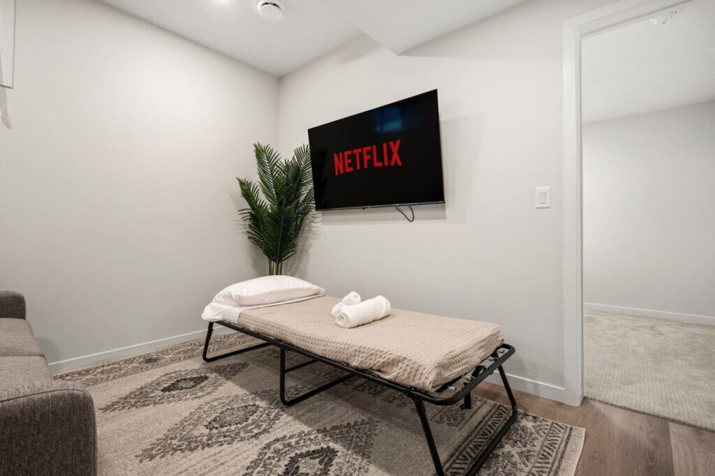 Experience a luxurious retreat in Glacier Ridge, nestled in a safe and family-friendly neighborhood just off Shaganappi Trail, minutes from the airport. This apartment offers a private entrance and non-shared space, featuring a cozy queen-size bed, two single bed cots, a full-size 4-piece bathroom, central heating, and a washer and dryer. Enjoy the comfort of a 50" smart TV with Netflix, high-speed Wi-Fi, and a fully stocked kitchen. The apartment is thoughtfully designed with a modern and inviting mood. The living room is equipped with a comfortable sofa and a 55" smart TV with Netflix, perfect for relaxation. The kitchen boasts stainless steel and custom appliances, including a 4-burner stove, oven, microwave, refrigerator, freezer, and dishwasher with pods provided. A Keurig coffee maker, toaster, blender, and essentials are also available, along with a dining table and bar stools. Optional upgrades include a National Park Entry, Welcome Basket, Birthday Decor Package, Romantic Wine and Flower Package, Spa at Home Package, Movie Night Upgrade, Christmas Tree and Decor, Halloween Decor and Pumpkin Carving Package, Winter Cozy Package, Beer Tasting Kit, Diffuser and Aroma Set, Additional Bedding and Sleeping Arrangements, Grocery Pre-Stocking Service, and a Pet Friendly Package, subject to availability. Located in Glacier Ridge, this apartment is transit-friendly with Calgary Transit bus routes providing convenient connections across the city. The neighborhood is walkable with expanding pedestrian pathways, parks, and local amenities, though some services may require a short drive. Bike-friendly routes are also planned, ensuring safe and accessible cycling for residents. With quick access to Stoney Trail and Trans-Canada Highway, exploring Calgary or heading to the mountains is a breeze. This is a basement suite, and while efforts are made for a peaceful stay, some noise from potential upstairs tenants may occur. The property is managed by a professional company, ensuring top-tier service with 24/7 guest support and communication. Full self check-in and check-out are available, with a personalized check-in experience through a custom-tailored link. A 2-car rear parking pad is provided, with free street parking available. Quiet hours are from 10 pm to 7 am, and a strict no-smoking policy is enforced with a $250 CAD fine for violations. No parties, drugs, excessive drinking, or loud music are allowed, and a noise detector is in place to maintain a peaceful environment. The apartment includes an office work area, providing a comfortable space for remote work with high-speed internet access.