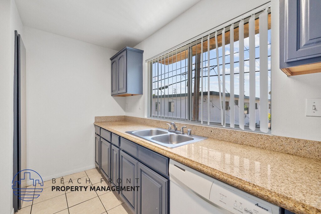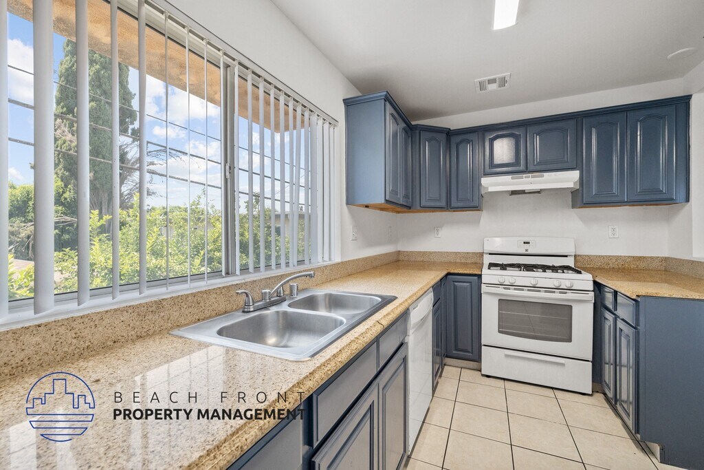 14740 Erwin St. 2 Bedroom Apartment in Van Nuys, CA This two-bedroom, one-bath apartment features light-colored vinyl flooring, a kitchen with granite countertops, blue cabinetry, and appliances including a gas stove, refrigerator, and dishwasher. The layout includes an open living and dining area, mirrored closets, and a bathroom with modern finishes and a shower-tub combo. The property offers secure underground parking, a landscaped courtyard with a decorative fountain, and an on-site laundry room. Located in a residential area of Van Nuys, near tree-lined streets and well-maintained surroundings. Professionally managed. Assistance animals accepted in accordance with applicable laws.