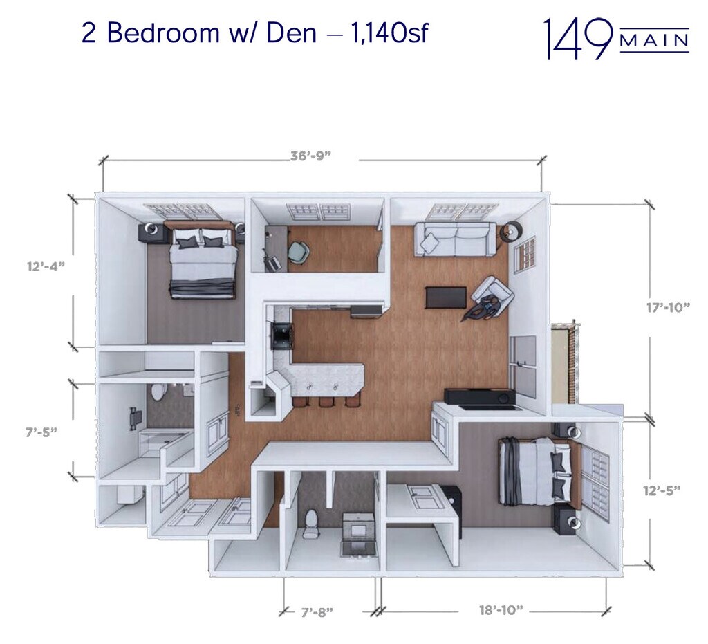 1 Bedroom w/ Den - Floorplan 1 Apartment Unit: 203Apartment Model: 1 Bedroom w/ Den$2,2501 Bedroom, 1 Bath, 712 sq ftAvailable November 10, 20252 Bedrooms