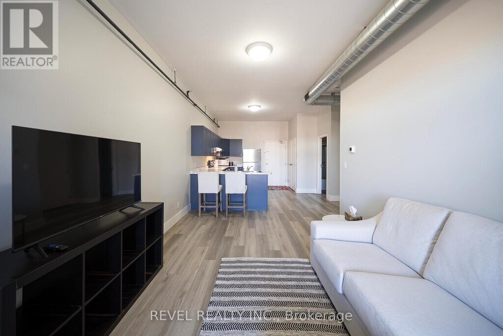 Welcome to 150 Colborne Street,Unit 407 - Downtown Brantford Living at Its Best! Step into style,comfort,and convenience with this fully renovated,loft-style 1-bedroom,1-bathroom condo,ideally situated in the heart of downtown Brantford,directly overlooking vibrant Harmony Square. Whether you're a first-time buyer,investor,or student,this stunning unit offers an unbeatable combination of modern living and prime location. Boasting high ceilings,a spacious private balcony,and sophisticated finishes throughout,this unit is designed to impress. The kitchen is a true showstopper,featuring rich navy cabinetry,ample storage and counter space,and stainless steel appliances - perfect for home chefs and entertainers alike. The open-concept layout seamlessly connects the kitchen,dining,and living areas,making entertaining both effortless and elegant. Step through French doors to your oversized balcony,large enough to accommodate outdoor dining or a cozy lounge setup - theperfect space to unwind while enjoying views of Harmony Square and all its seasonal events. The bright and airy bedroom is bathed in natural light thanks to a charming arched window and includes a generous closet. The updated 4-piece bathroom continues the modern aesthetic with stylish finishes and thoughtful design. Additional features include coin-operated laundry facilities conveniently located within the building,eliminating the need for off-site trips. The air conditioner was replaced in 2024. Location is everything - and this property delivers. Just steps from Wilfrid Laurier University's Brantford campus,the Conestoga College campus,and the new YMCA/Laurier Recreation Complex. With countless restaurants,cafes,shops,and year-round festivals right outside your door,you'll be at the centre of it all. Amazing opportunity to experience one of Brantford's most dynamic and walkable neighbourhoods. (id:52069) ID#: 2253398