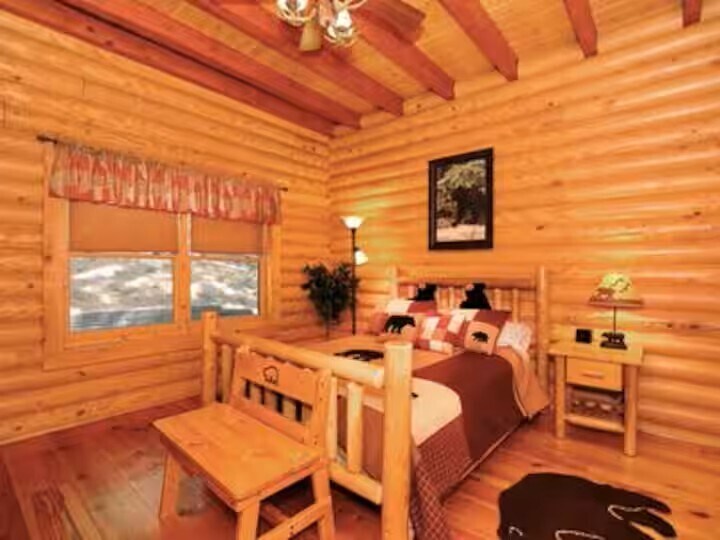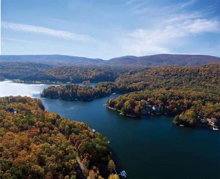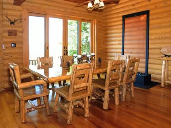 FULLY FURNISHED Furniture, linens, hot tub, games, dishes, kitchen utensils, etc. We can't wait for you to experience the beauty, nature, and peacefulness of Lake Arrowhead. We welcome you to enjoy our custom log cabin home (sleeps 6) complete with metal roof which is the color of oxidized copper. We have 3 bedrooms and a sleeping loft, 3 full baths, hot tub, sauna, game loft, two decks with beautiful views, professionally decorated modern kitchen, newer electronics, linens, bedding, rustic real log furniture, etc. Our mountain top cabin is nestled in the treetops of one of the highest ridges in beautiful Lake Arrowhead. Once there, you will enjoy the panoramic vista, which includes our pristine, spring fed Lake Arrowhead, Kennesaw Mountain as well as the lights of Atlanta in the evening. The great room overlooks the beauty of our community as well as our pristine lake and onto the sights of the North Georgia mountains. A wood burning stove is there for your nostalgic warmth and comfort. Our state of the art professionally decorated kitchen is designed to bring you back to memories of the turn of the century. The antique camouflaged Elmira stove conceals a secret modern electronic appliance with glass top stove and oven. The kitchen cabinets are replicated to resemble oxidized copper panels, which are accented with black granite counter tops, appliances and stainless steel.