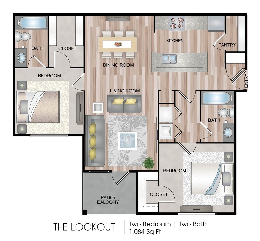Apartment Model: The LookoutFrom $1,1952 Bedroom, 2 Bath, 1084 sq ftAvailable Now![]()