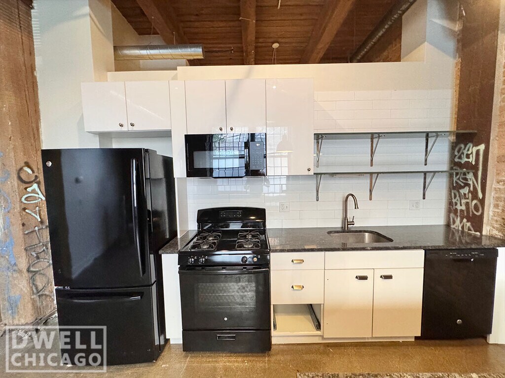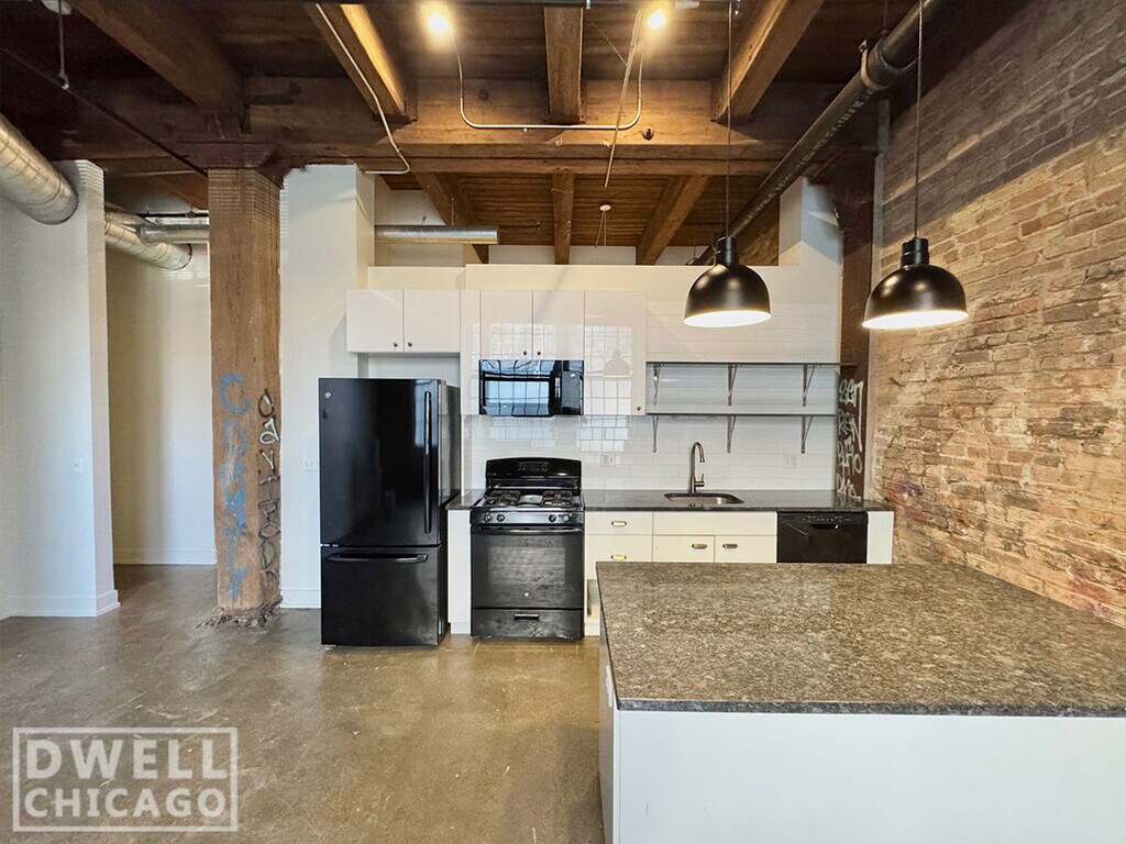 1 Bedroom + Den Spacious loft-style one bedroom plus den with timber beams, exposed brick, and oversized windows that bring in great light. The open living area connects to a modern kitchen with quartz countertops, subway-tile backsplash, custom cabinetry, and full-size in-unit washer/dryer. • Flexible den space works as a home office or guest nook • Glass-enclosed rain shower in the updated bath • High ceilings with loft character throughout