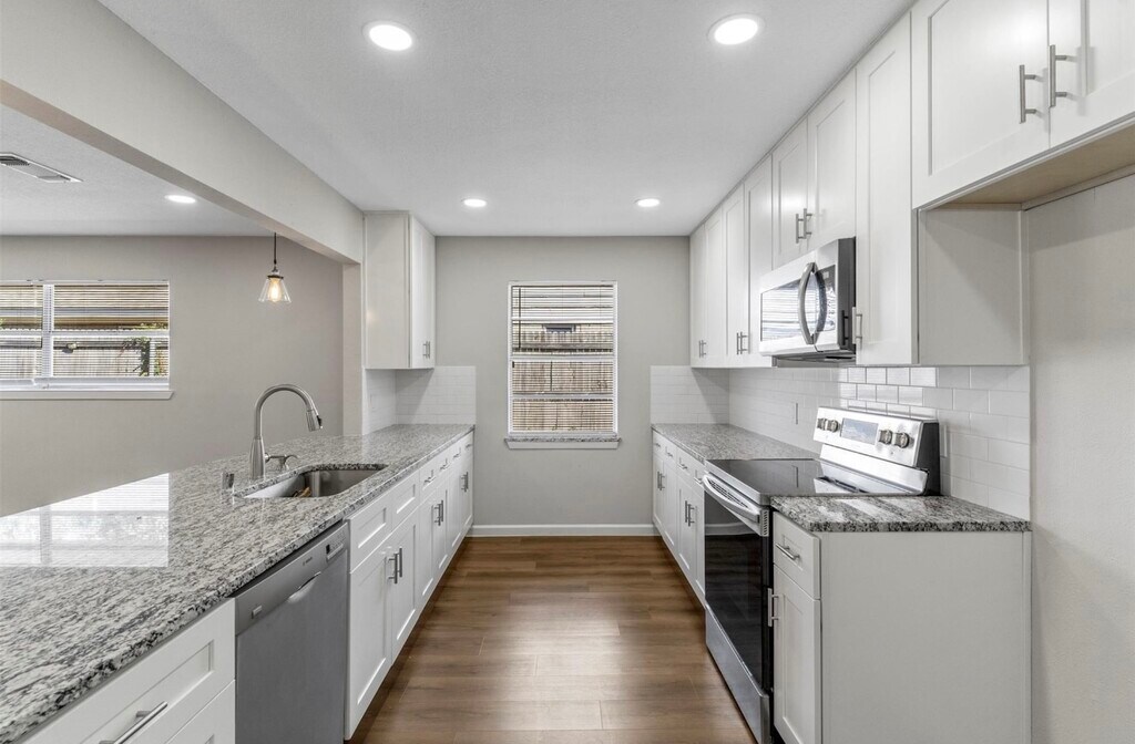 This beautiful three-bedroom, two-bath home with an office has been fully updated. Enter through the modern gate to find a charming courtyard. The bright office features bay windows and overlooks the courtyard. The renovated kitchen boasts newer cabinets, granite countertops, and high-end appliances. The bathrooms have been upgraded with nice fixtures, including countertops, faucets, and tiles. Enjoy wood flooring throughout the house, fresh tiles in all bathrooms, and clean carpet in the bedrooms. The detached building offers a garage and a large bonus space, perfect for a home gym or workshop. The spacious backyard complements the courtyard, making it great for outdoor activities. Don't miss this opportunity! No application fee. One month's security deposit is required.