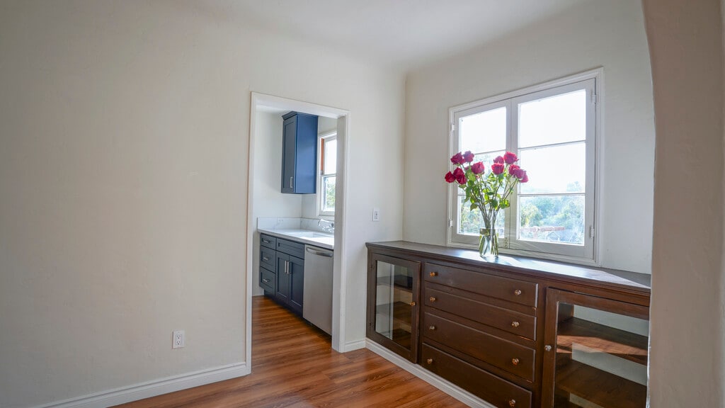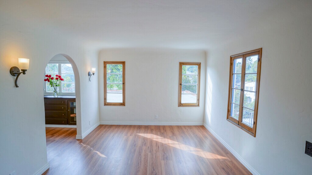 California Dreaming at the top of the hill in Elysian Heights. Live the Californian dream lifestyle in a , 2 bedroom, 1 bathroom duplex unit with ample natural light and drop dead gorgeous views, steps from the natural beauty of Elysian Park, high above Echo Park, next to Silverlake. This fully restored Spanish revival boasts a brand new kitchen with all new appliances, including an Italian refrigerator, new oven and range, microwave, dishwasher and granite kitchen counters and navy blue soft close shaker cabinets, Fully updated bathroom with inlaid marble floors, handmade subway tiles and a spacious bathtub/shower for soaking and new vanity. Dining room with original built in credenza, new wood laminate floors, gorgeous living room, new lighting throughout, and all the original Spanish flair including arched doorways. Cool and comfortable primary bedroom and sunlit second bedroom or office with access to massive outdoor patio, outdoor fireplace and dining area. Private front yard. Mature fruit & pine trees. Brand new central AC & heating system throughout. New private laundry. Off street parking included. Tons of outdoor space, amazing views. Steps from all the hotspots: Bacetti, El Moro, Canyon Coffee, Lady Byrd Cafe, Dada, Donna’s, Edendale, and so much more! Live in the uber chic Elysian heights neighborhood and be the envy of everyone with this Spanish revival with all the charm, modern amenities, and class that is only rarely available these days. Lovingly restored to her glory days, this Eastside gem is the property you need to live the casual, indoor outdoor lifestyle you crave. The layout of the space is perfect for an individual, or a couple. $3,800 per month, all utilities included, except internet/TV. This is a 12 month lease. Act fast before this property is off market again!