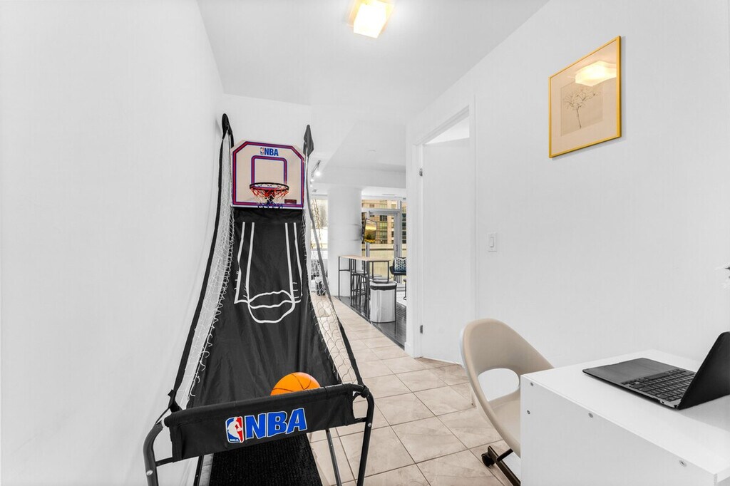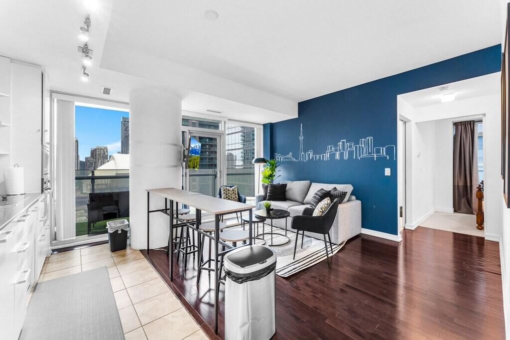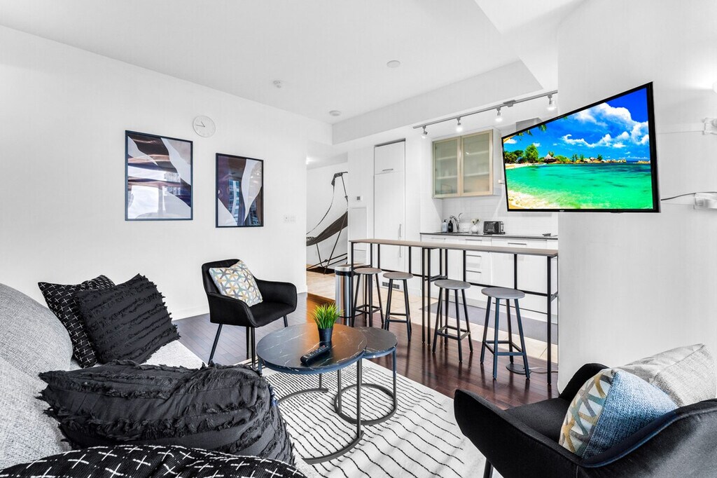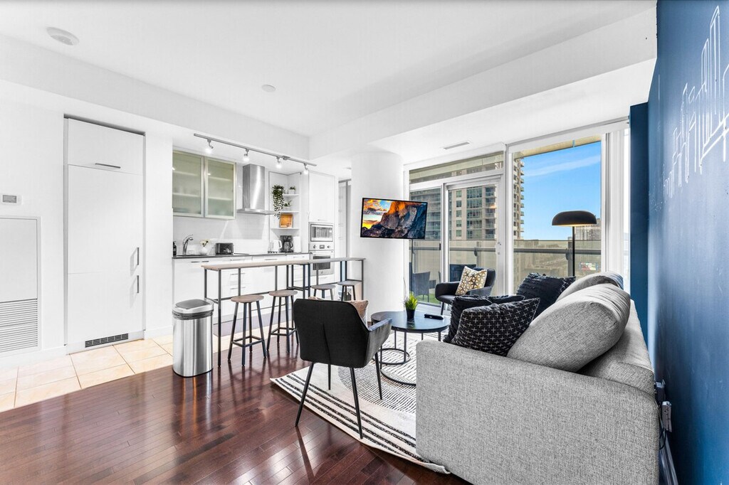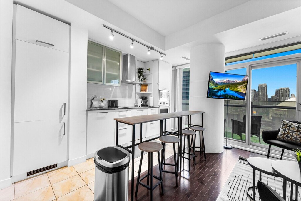 Welcome to your stylish home away from home! This bright and modern 2-bedroom condo offers the perfect blend of comfort and city living. Located in the heart of Ontario, you’ll enjoy stunning skyline views right from your living room or balcony. The entire condo includes two premium memory foam queen beds, one queen sofa bed, and natural light in all parts of the unit with city and lake views. Catch beautiful sunset moments of the city. The fully stocked kitchen with a toaster, microwave, and all kitchen essentials makes for fun and seamless cooking nights. The spacious living room with cozy furniture is perfect for your group to relax and wind down. A 55” smart TV is available for your convenience, and unlimited high-speed internet is provided. A washer and dryer are included in the main closet. Location is everything! Within walking distance from the building, you can visit the CN Tower, Ripley's, arcade, restaurants, and lakeshore for lake view walks—all within a 5-minute walk. The building is also accessible to the Gardiner Expressway for easy access to the highway. Toilet paper, garbage bags, and basic toiletries will be provided at the beginning of the stay. It will then be the guest's responsibility to provide for these for the remainder of their stay. Amenities are only accessible for guests staying over 28 days as per the building policy. The elevators might be slower than usual due to other rentals in the building. There is a strict no-smoking and no-party policy at the property. Violations of these policies will result in a $1000 fine respectively. There is a noise monitoring device installed in the unit that tracks volume decibels, but it does not record audio to ensure privacy for all guests. Registration Number: STR-2404-FRZVHQ