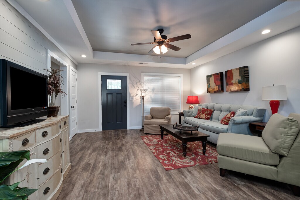 Professionally decorated, fully furnished. Shiplap wall, tray ceilings, custom kitchen with stainless steel appliances. Covered porches on front and rear. Professional landscaping. Under cabinet task lighting for kitchen counters. DSL/wifi, water, electricity, Spectrum TV, lawn maintenance, city sanitation - all provided; washer/dryer. No pets, no smoking. Spacious, private, off street parking. Must see!