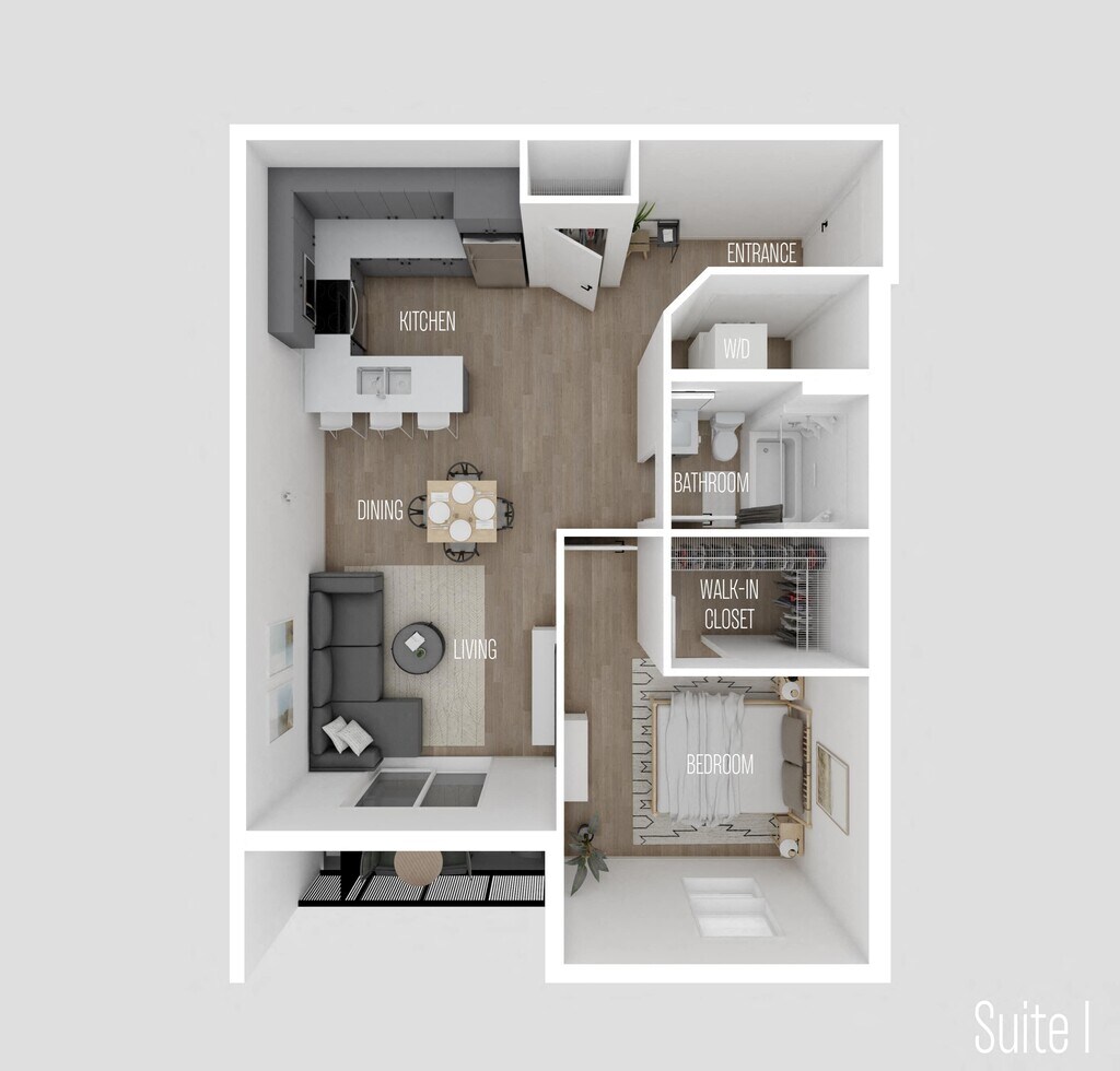 Suite I - Floorplan 6 Apartment Unit: 212Apartment Model: Suite I1 Bedroom, 1 Bath, 712 sq ftAvailable May 1, 2026Suite B