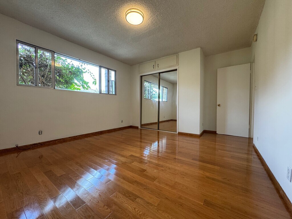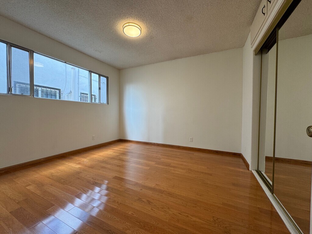 Bright and airy owner's unit in 6 unit bldg with floor to ceiling living room windows, oak hardwood floors throughout, central heating and A/C, tile kitchen counter tops, large bedrooms with mirrored nearly wall to wall closets, linen closet and storage in the hall stove, fridge and garbage disposal . Laundry room in the building, controlled access with remote controlled security gate, and one onsite parking space included (second space available). Quiet building on the nicest block in the area centrally located near Venice Blvd. and La Brea with close transportation, shopping and nearby museums. No smoking anywhere in or on the property. This apartment is offered unfurnished only and will be available September 5th or sooner.
