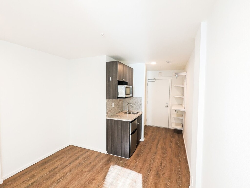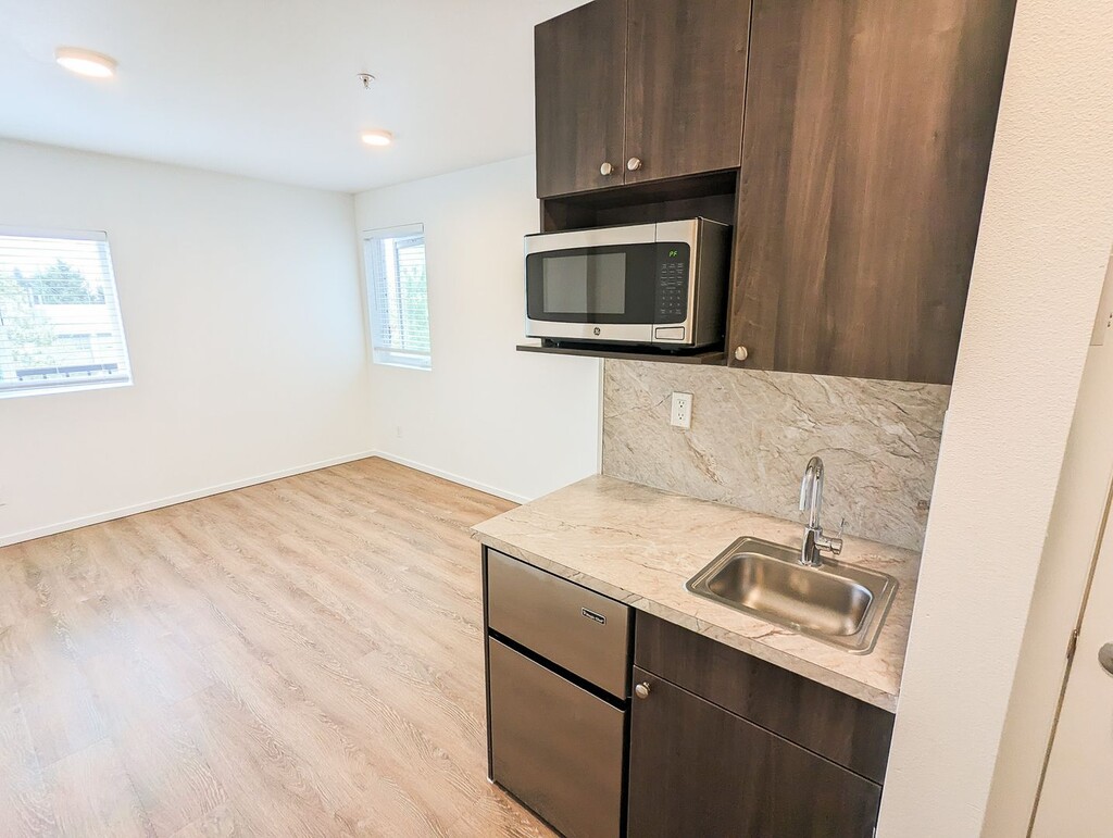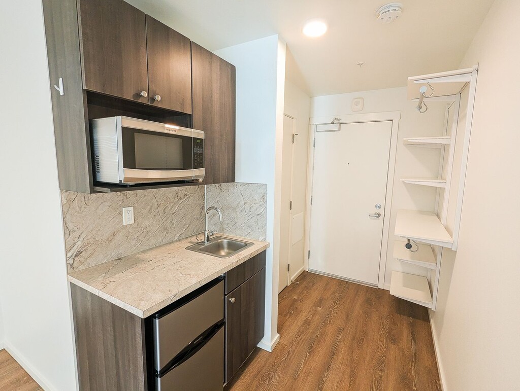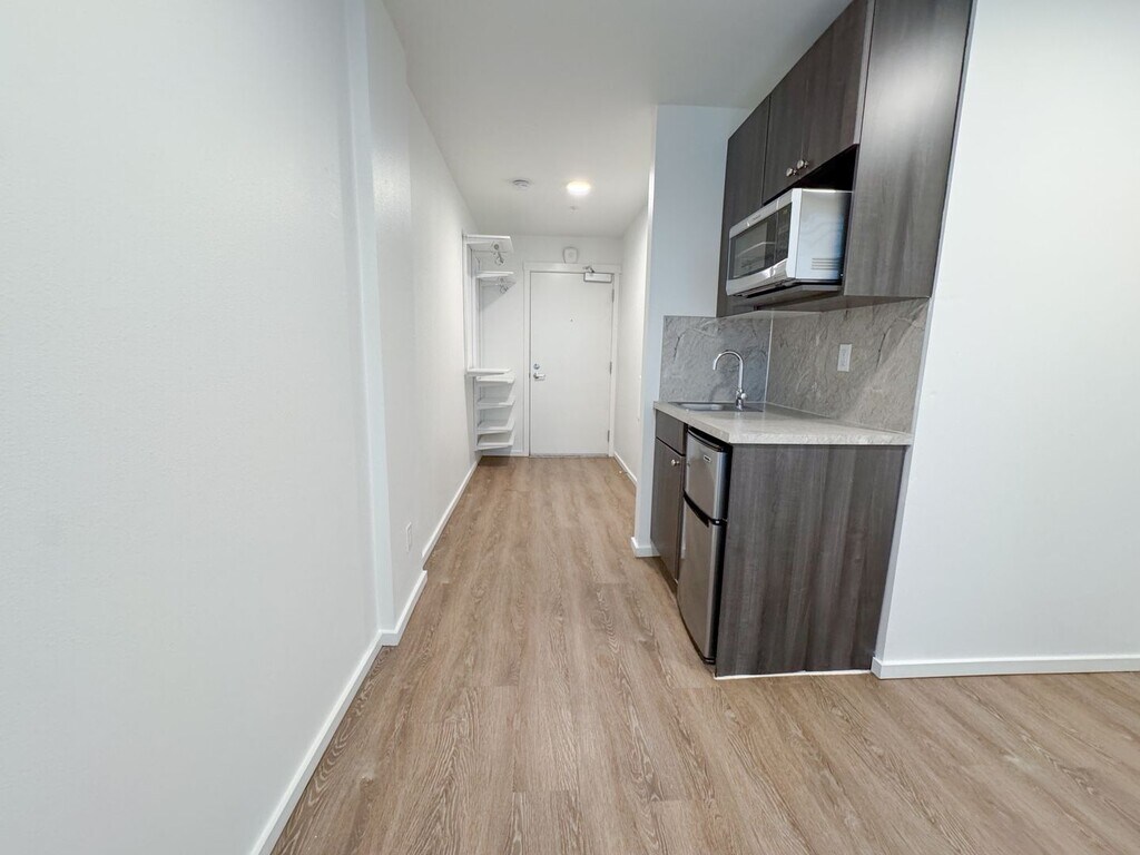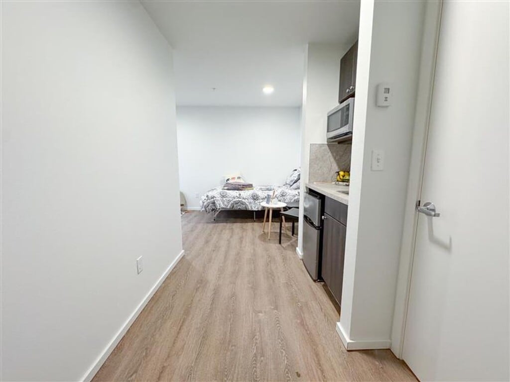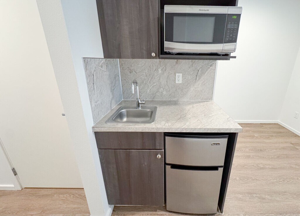 October 8, 2018I lived here for a summer. Good, semi-cheap studio apartments. I had to sign without visiting the place, and I was kind of disappointed when I got there. There are cons that the listing doesn't cover. Overall it was acceptable. They changed their short-term lease policy right before I signed, which wasn't great, unless they change it back it may not be the best for short-term. Pros: - Cheap-ish for the area. - New building. Everything is nice and clean, appliances all in great condition. - ...Walking distance from grocery stores, restaurants, parks. Right next to the transit center, lots of easily accessible bus routes. - Quiet (aside from the garage door). - Comes with great internet. - Furnishings: simple desk and chair, bed frame and mattress, microwave, mini fridge and freezer. Good laundry machines in the hallway. Cons - Floors are cement in the units and most common rooms. It's mostly smooth but has a lot of small bumps, never looks clean because of the spots and non-uniform color. Makes the rooms echo a lot. - No sink in the bathroom. There is only a tiny (maybe 9" by 12") sink in the kitchenette. - No AC. In the summer my room got up to the upper 80s, but I think there's only a few weeks out of the year that are bad. - Heating is through the floor, and takes 24 hours to reach the temperature you set. - Some rooms have twin sized beds. You have to ask. - No closet or dresser. Some wall-mounted shelves are provided. - There are common kitchens, but the fridges are each entirely taken up by 4 tenants who put large plastic boxes full of their food in them, so you generally have to carry all your stuff up from your room. You can't leave dishes or cooking utensils there unless you are OK with anyone in the building using them (according to the property manager). I just bought a hot plate to use in my room.Read MoreReview from Apartments.com