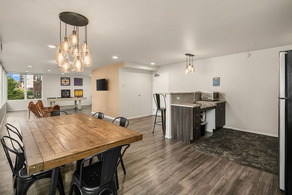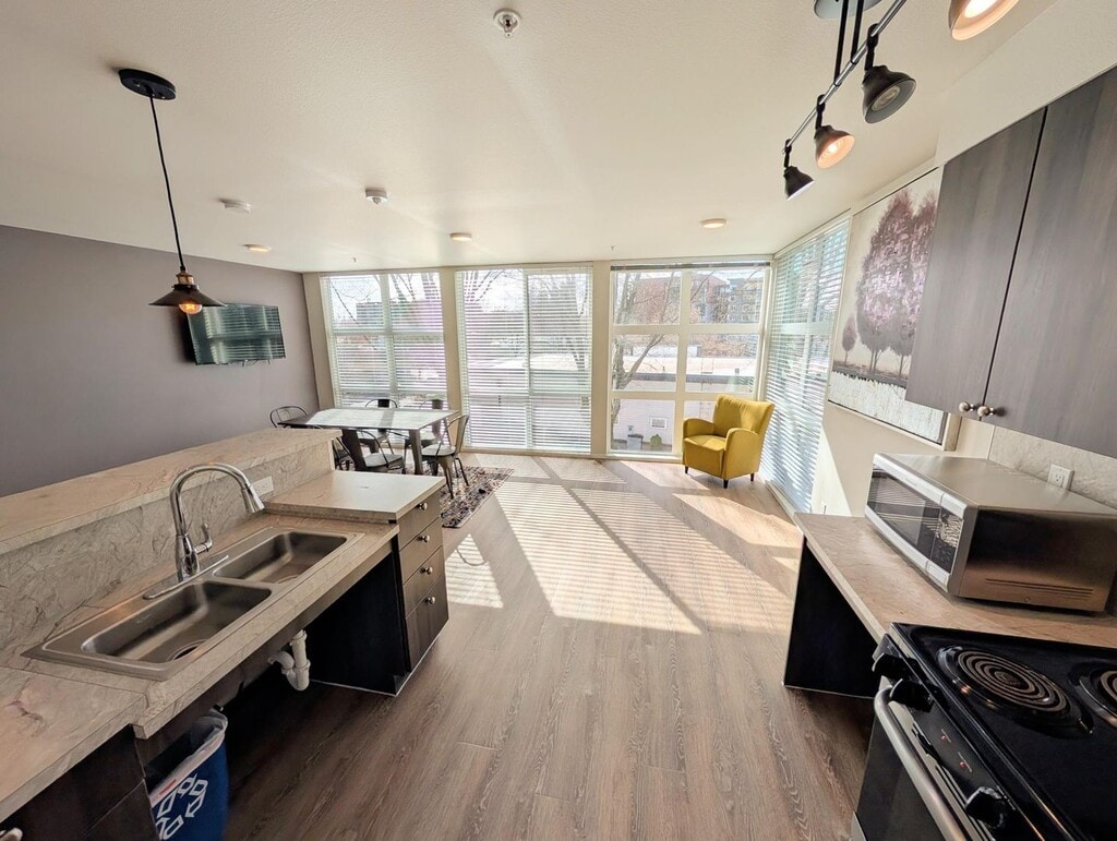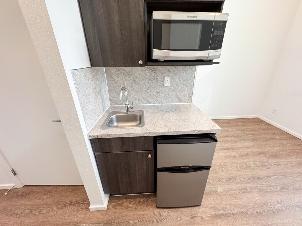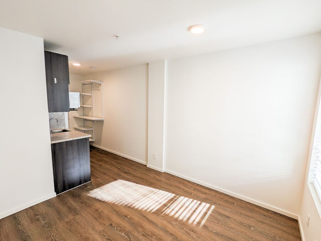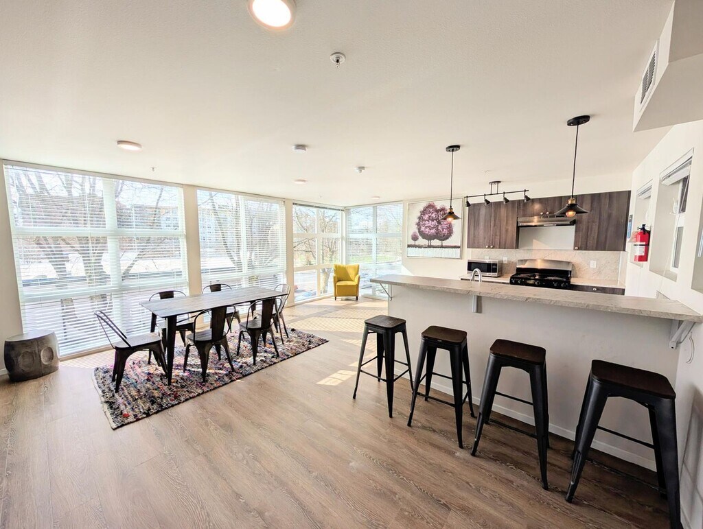 October 8, 2018I lived here for a summer. Good, semi-cheap studio apartments. I had to sign without visiting the place, and I was kind of disappointed when I got there. There are cons that the listing doesn't cover. Overall it was acceptable. They changed their short-term lease policy right before I signed, which wasn't great, unless they change it back it may not be the best for short-term. Pros: - Cheap-ish for the area. - New building. Everything is nice and clean, appliances all in great condition. - ...Walking distance from grocery stores, restaurants, parks. Right next to the transit center, lots of easily accessible bus routes. - Quiet (aside from the garage door). - Comes with great internet. - Furnishings: simple desk and chair, bed frame and mattress, microwave, mini fridge and freezer. Good laundry machines in the hallway. Cons - Floors are cement in the units and most common rooms. It's mostly smooth but has a lot of small bumps, never looks clean because of the spots and non-uniform color. Makes the rooms echo a lot. - No sink in the bathroom. There is only a tiny (maybe 9" by 12") sink in the kitchenette. - No AC. In the summer my room got up to the upper 80s, but I think there's only a few weeks out of the year that are bad. - Heating is through the floor, and takes 24 hours to reach the temperature you set. - Some rooms have twin sized beds. You have to ask. - No closet or dresser. Some wall-mounted shelves are provided. - There are common kitchens, but the fridges are each entirely taken up by 4 tenants who put large plastic boxes full of their food in them, so you generally have to carry all your stuff up from your room. You can't leave dishes or cooking utensils there unless you are OK with anyone in the building using them (according to the property manager). I just bought a hot plate to use in my room.Read MoreReview from Apartments.com