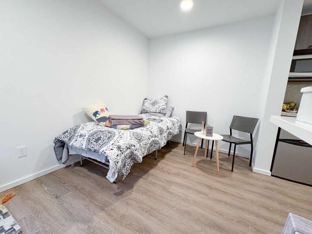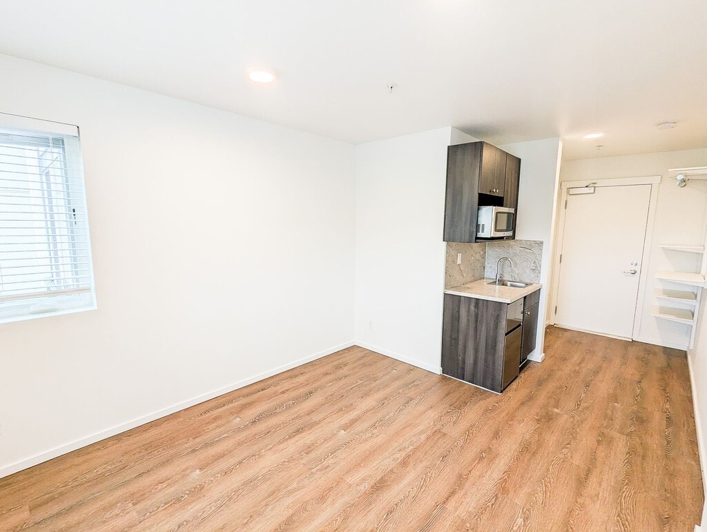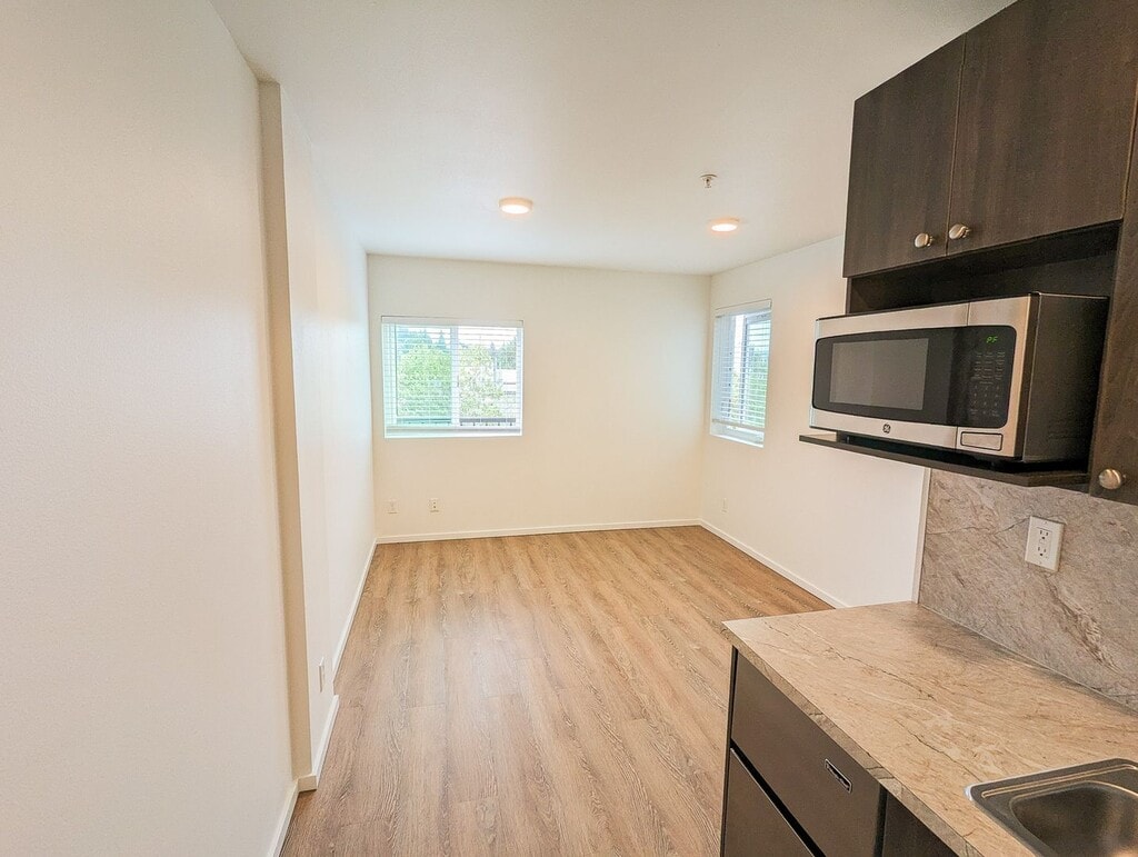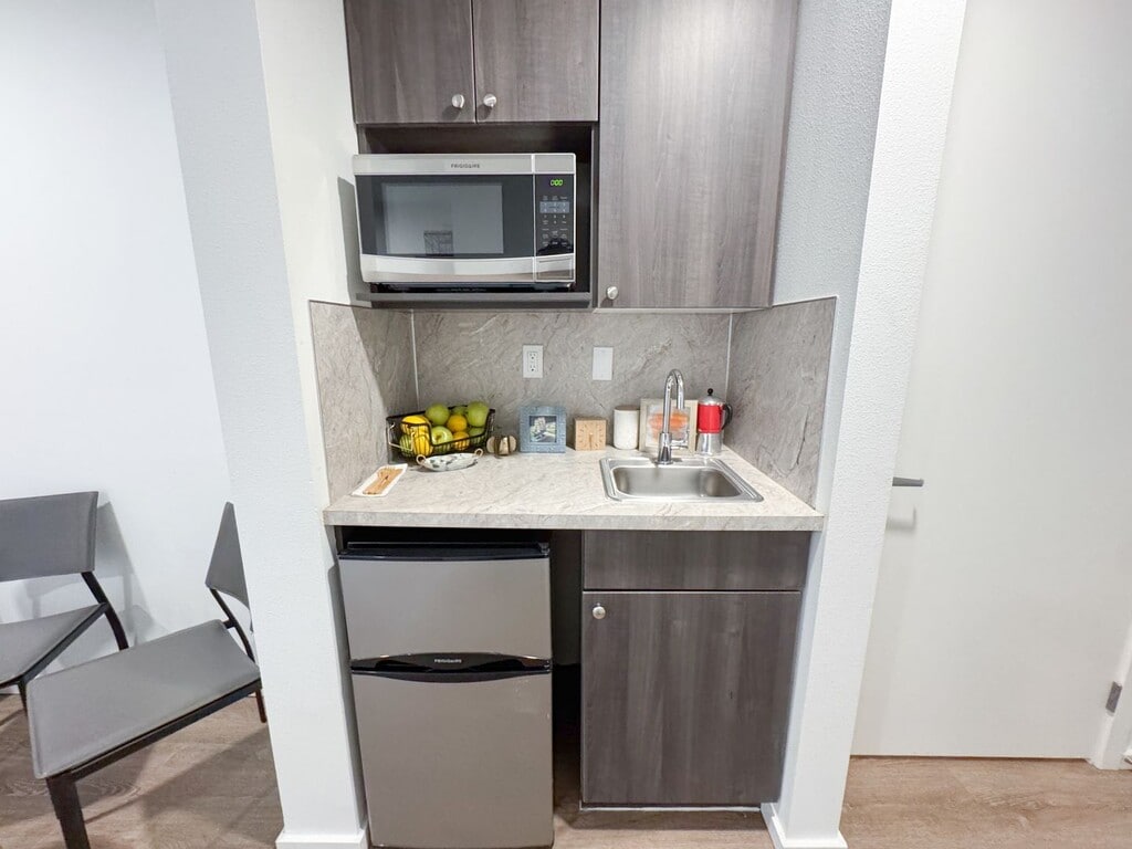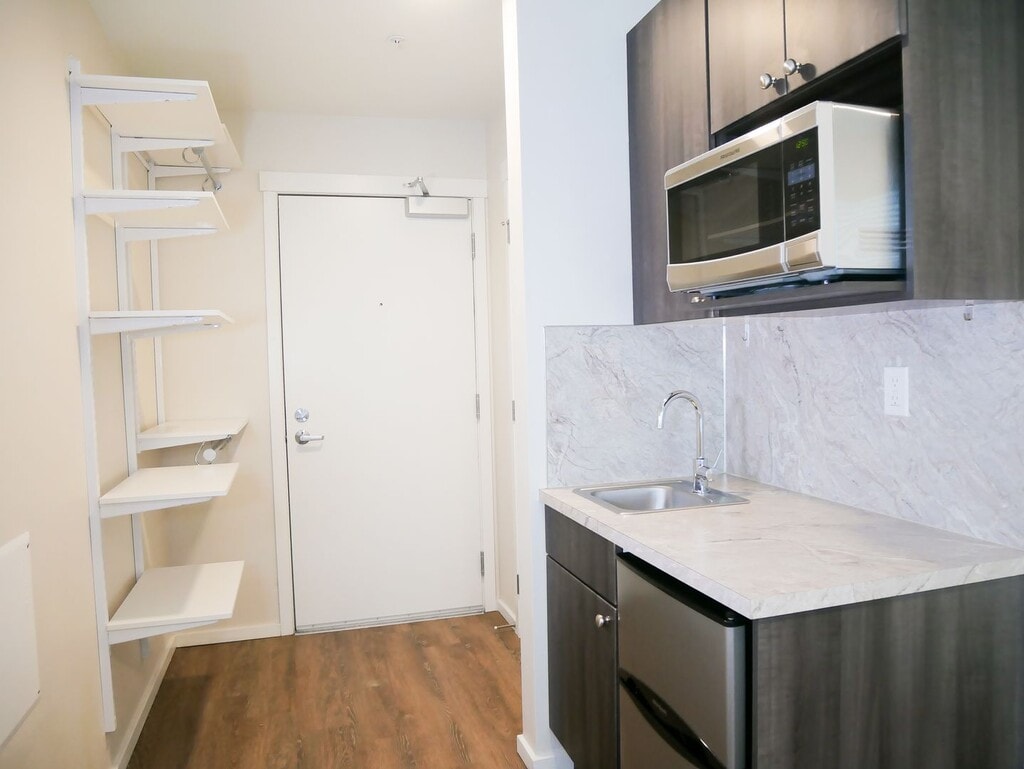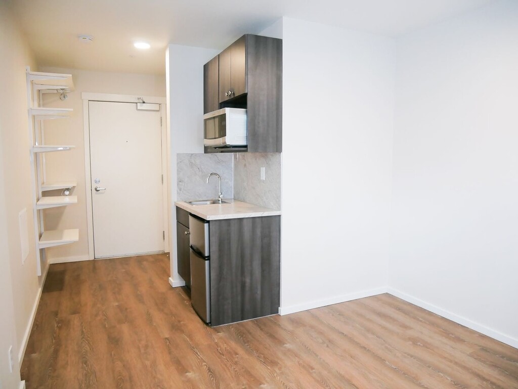 October 8, 2018I lived here for a summer. Good, semi-cheap studio apartments. I had to sign without visiting the place, and I was kind of disappointed when I got there. There are cons that the listing doesn't cover. Overall it was acceptable. They changed their short-term lease policy right before I signed, which wasn't great, unless they change it back it may not be the best for short-term. Pros: - Cheap-ish for the area. - New building. Everything is nice and clean, appliances all in great condition. - ...Walking distance from grocery stores, restaurants, parks. Right next to the transit center, lots of easily accessible bus routes. - Quiet (aside from the garage door). - Comes with great internet. - Furnishings: simple desk and chair, bed frame and mattress, microwave, mini fridge and freezer. Good laundry machines in the hallway. Cons - Floors are cement in the units and most common rooms. It's mostly smooth but has a lot of small bumps, never looks clean because of the spots and non-uniform color. Makes the rooms echo a lot. - No sink in the bathroom. There is only a tiny (maybe 9" by 12") sink in the kitchenette. - No AC. In the summer my room got up to the upper 80s, but I think there's only a few weeks out of the year that are bad. - Heating is through the floor, and takes 24 hours to reach the temperature you set. - Some rooms have twin sized beds. You have to ask. - No closet or dresser. Some wall-mounted shelves are provided. - There are common kitchens, but the fridges are each entirely taken up by 4 tenants who put large plastic boxes full of their food in them, so you generally have to carry all your stuff up from your room. You can't leave dishes or cooking utensils there unless you are OK with anyone in the building using them (according to the property manager). I just bought a hot plate to use in my room.Read MoreReview from Apartments.com