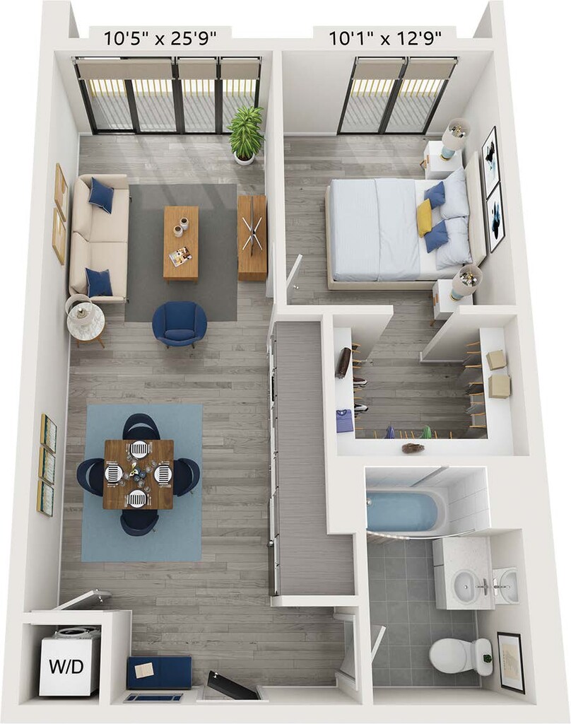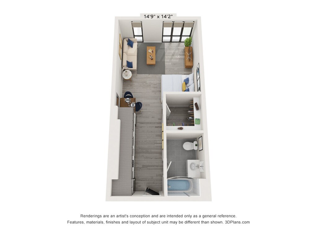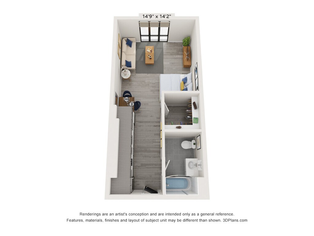 Apartment Model: Studio SouthFrom $1,695Studio, 1 Bath, 437 sq ftAvailable NowStudio South - Floorplan 1 Studio West