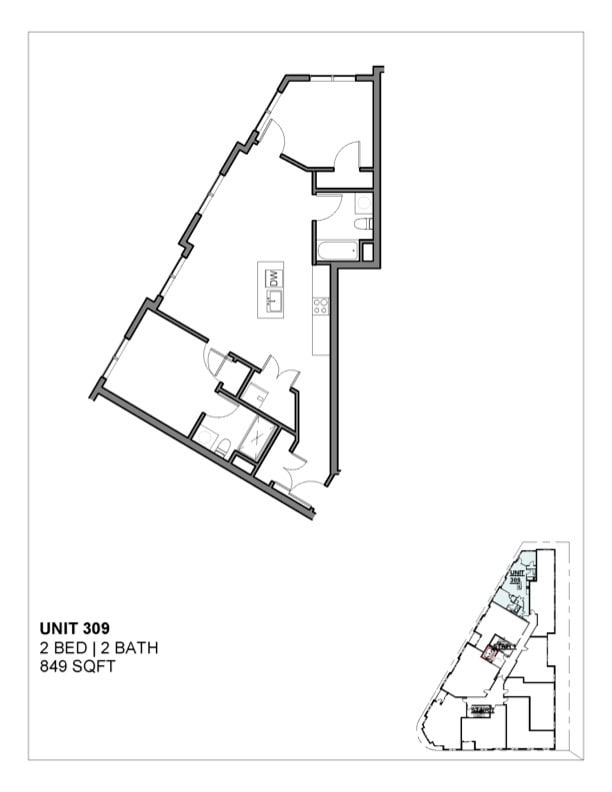 Apartment Model: 209 & 309$3,5002 Bedroom, 2 Bath, 849 sq ftAvailable June 1, 2026Floor plans are artist's rendering. All dimensions are approximate. Actual product and specifications may vary in dimension or detail. Not all features are available in every rental home. Please see a representative for details.