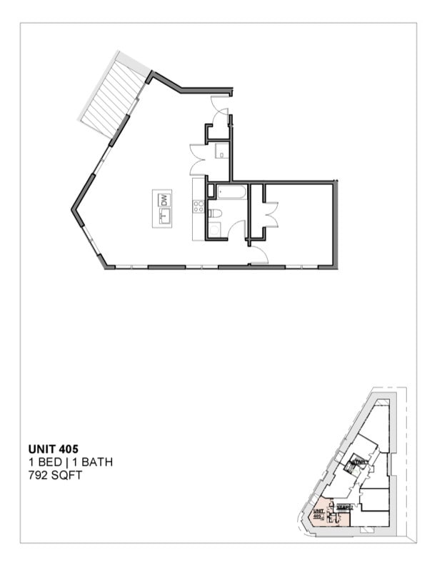 405 - Floorplan 7 Apartment Unit: 405Apartment Model: 405$2,9001 Bedroom, 1 Bath, 792 sq ftAvailable April 1, 2026208 & 308
