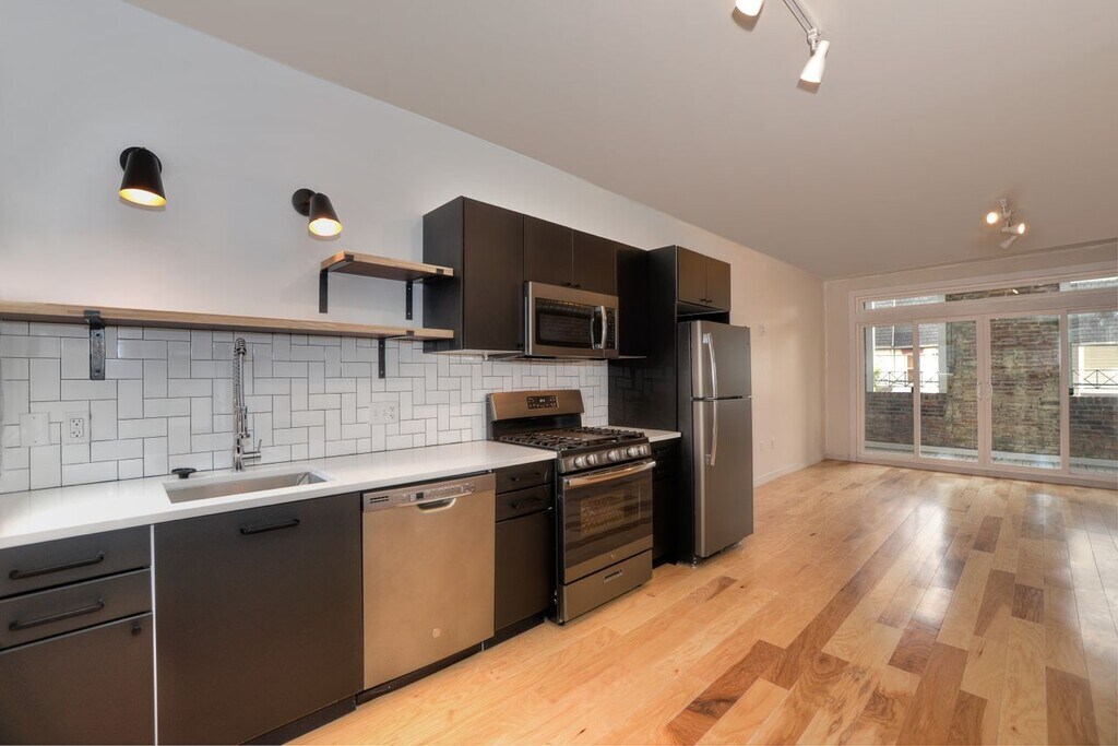 This 2-bedroom, 2-bath two-story townhouse blends cool industrial vibes with modern comfort. The second floor has an open layout with exposed brick, hardwood floors, and sleek matte black kitchen cabinets (with a giant pantry) alongside quartz countertops. You’ll love the open shelving, herringbone tile, and stainless appliances — perfect for anyone who likes to cook or just wants a good-looking kitchen. Off the living space, set up a perfect private patio for your coffee in the morning or a summer glass of wine at night with friends. Upstairs (third/top floor), there are two bedrooms and two baths including a primary with n ensuite bath with a built-in custom closet shelving. Both BR's are full of natural light and have a clean, minimal feel. This pet-friendly apartment is ready for you to call it home. Stop out for a tour today.