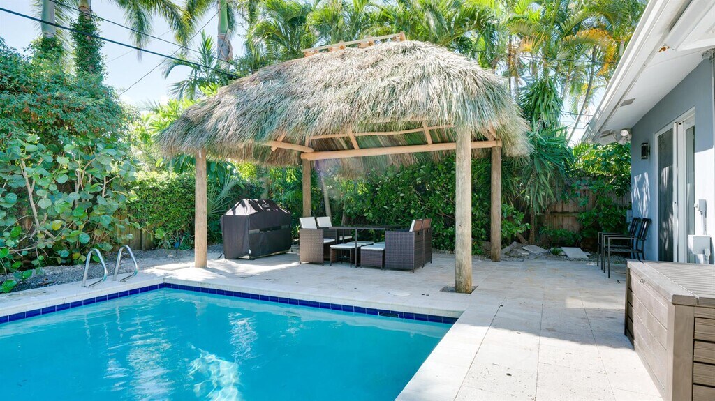 Immaculate and modern 4-bed, 2-bath pool home in highly sought-after Poinsettia Heights--just minutes from the beach, Wilton Manors, Las Olas, and downtown Fort Lauderdale. This updated home features a bright open layout, designer kitchen with quartz countertops and stainless appliances, spacious bedrooms, and sleek finishes throughout. Step outside to your private tropical oasis with a sparkling pool, tiki hut, grill, and comfortable outdoor seating--perfect for entertaining or relaxing. Offered furnished (optional) and meticulously maintained, with weekly pool and landscaping service included for a truly effortless lifestyle. Landscape and pool service included. Listing Courtesy of: Jeff Lippman/ SimpliHOM