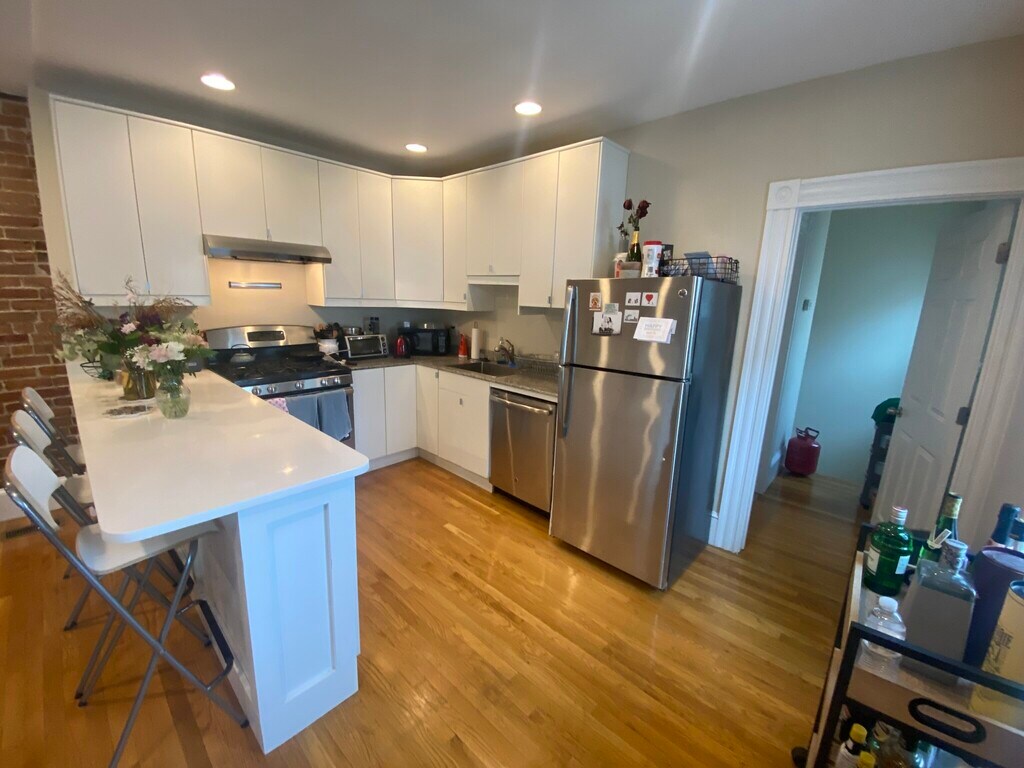 Condo Quality Large 3 Bedroom, 2 Bathroom in the Heart of Davis Square! Large open concept kitchen/living with Exposed Brick and large windows giving lots of light. Two floors of living with a second common living space on the top floor. The entire home was gut renovated in 2018. FEATURES: Central A/C, In-Unit Laundry. Chefs kitchen w/ Stainless Steel Appliances, Granite & Quartz countertop, breakfast bar, Dishwasher/Disposal, 5 Burner Gas Stove. 1 large bedroom on the main floor and 2 large bedrooms and 2nd living room on top floor. Additional storage in the basement. Large shared yard, great for BBQs! 0.2 Miles to the Davis Square Red Line T stop on a quiet tree-lined street but close to everything! For all showing requests & questions on leasing - Contact Joe from Red Tree Real Estate by calling or inquiring through this listing