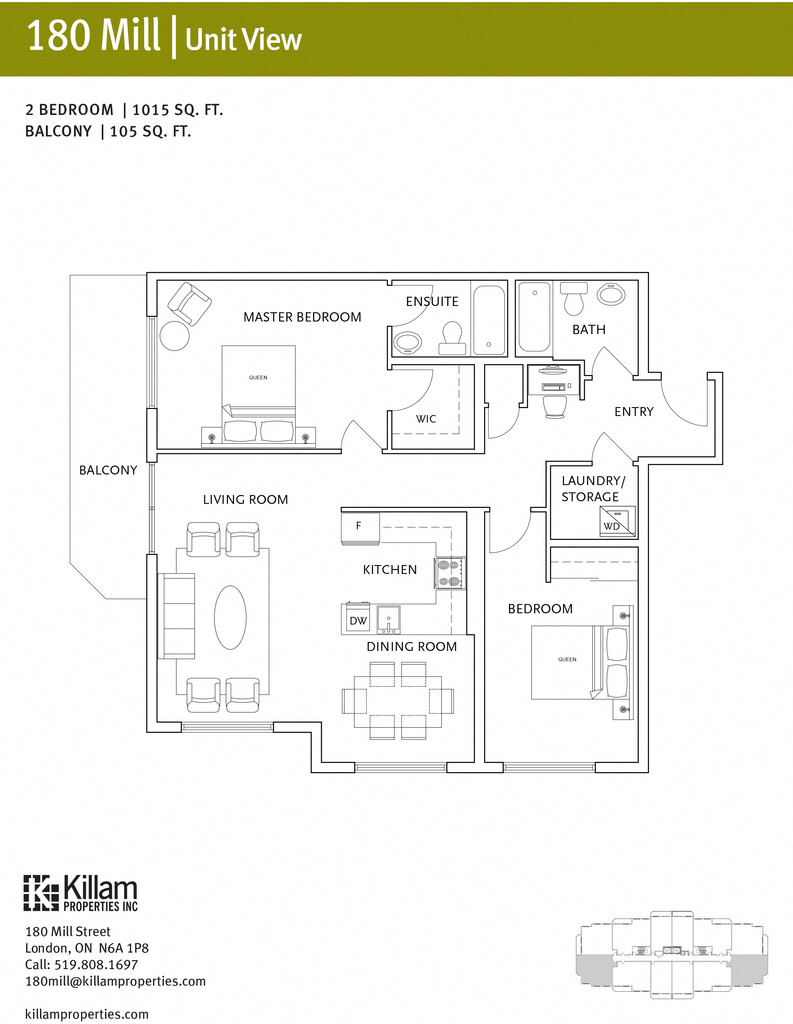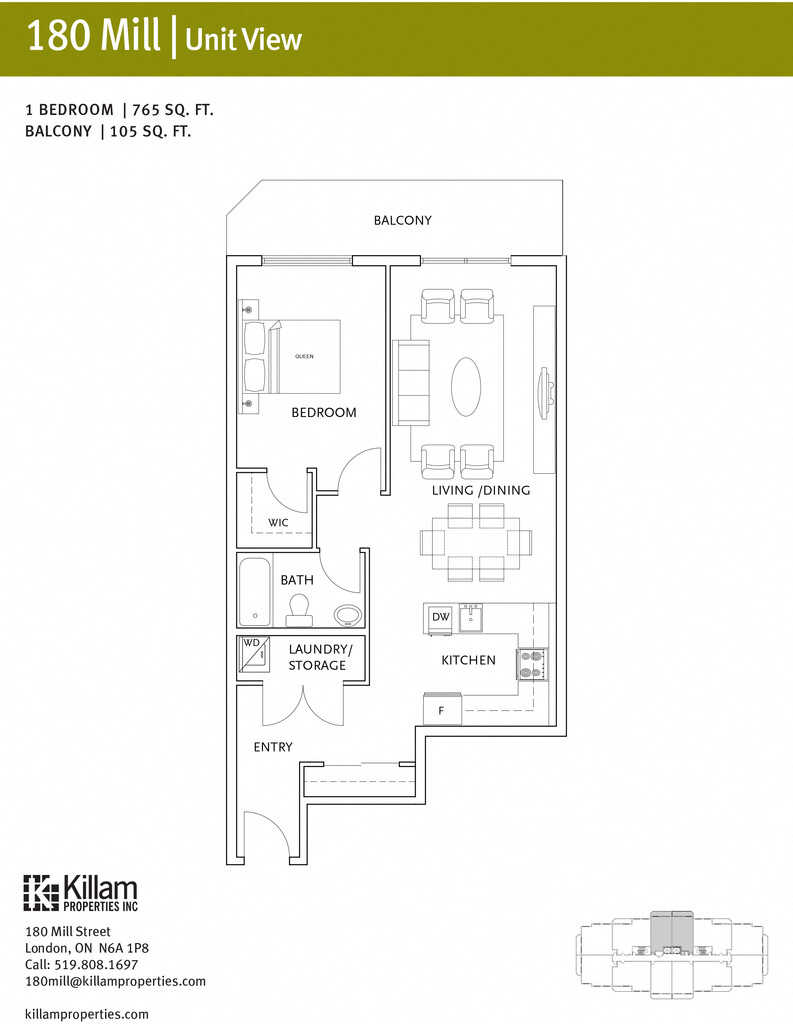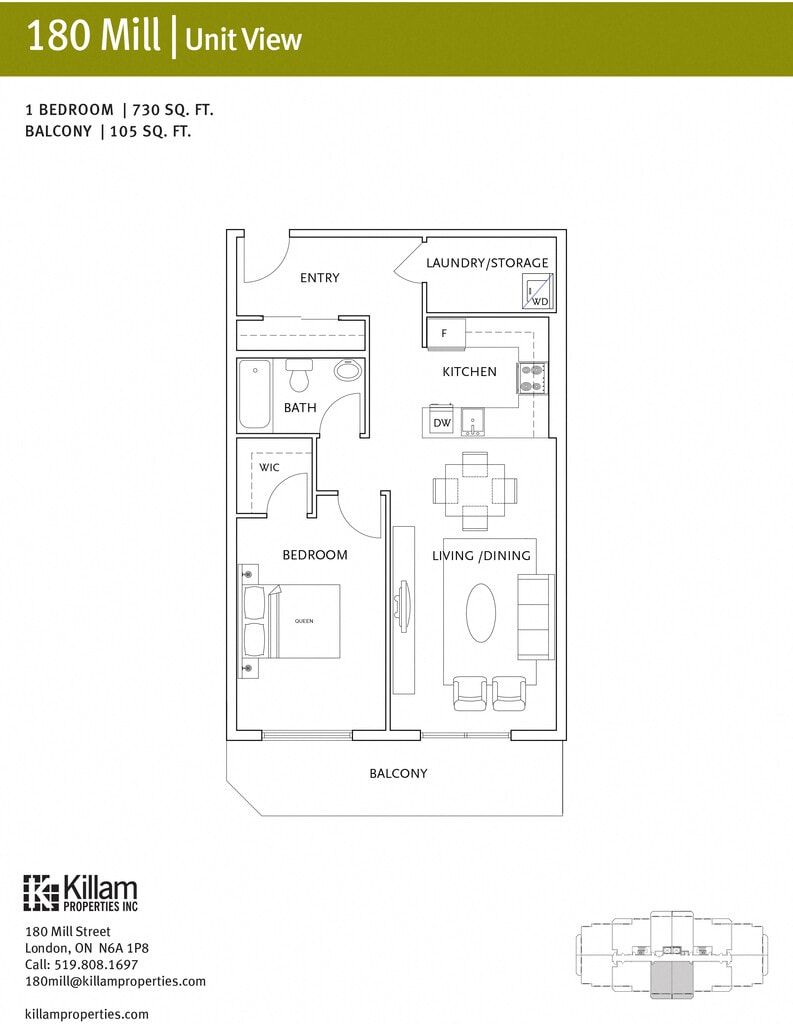 180 Mill Street offers 1 to 3 Bedroom apartments starting from C$1,785 and having 730–1,962 sq ft. Here is the current pricing and availability:
