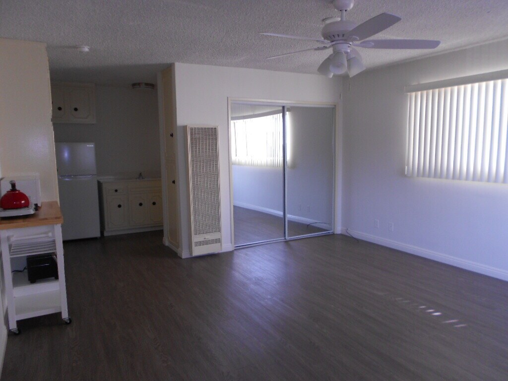 A very bright and spacious remodeled top floor Studio with all paid utilities. This unit features laminate (hardwood like) flooring throughout, air conditioning, kitchenette with microwave, hotplate, toaster oven, and full-size refrigerator. Lots of closet space throughout. One (1) assigned carport parking space is available (for an additional charge). Laundry Room on premises with coin operated equipment. One (1) year minimum lease