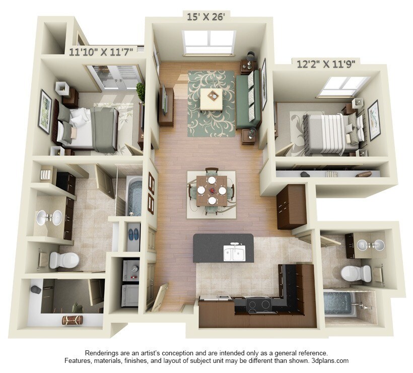 Apartment Model: B2A2 Bedroom, 2 Bath, 1215 sq ftUnavailableFloor plans are artist's rendering. All dimensions are approximate. Actual product and specifications may vary in dimension or detail. Not all features are available in every rental home. Prices and availability are subject to change. Base rent is based on monthly frequency. Additional fees may apply, such as but not limited to package delivery, trash, water, amenities, etc. Deposits vary. Please see a representative for details.