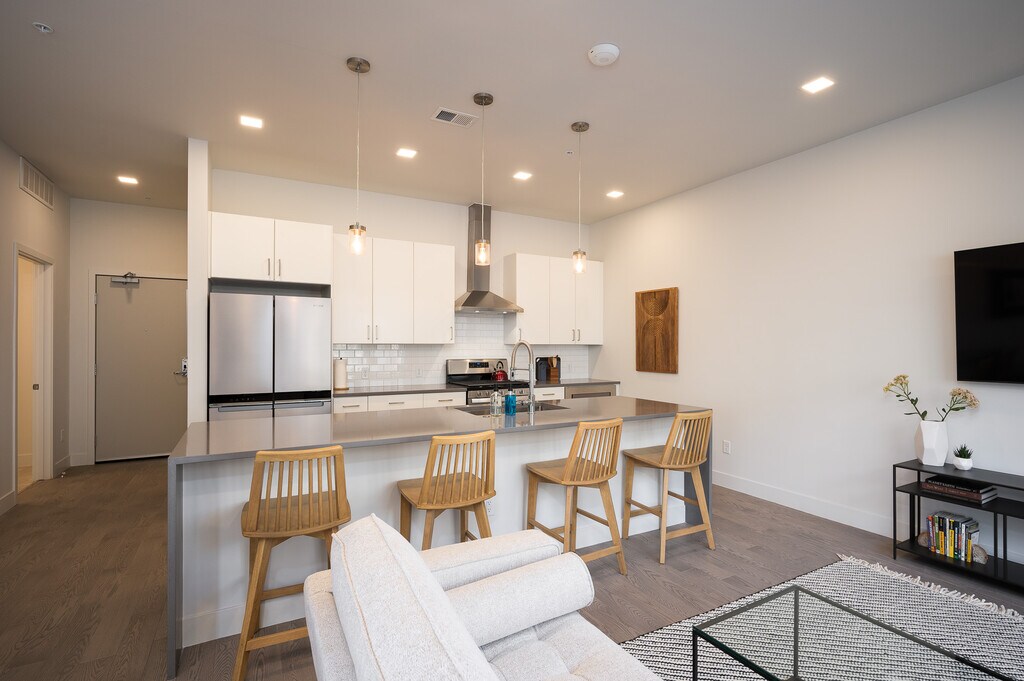 Light, bright and spacious 1 Bed + Den/Office, 2 Bath condo in hot South Broadway neighborhood! – 900sf open floor plan with high ceilings and floor-to-ceiling windows letting in lots of natural light – Large open kitchen with quartz countertops, stainless steel appliances, and white cabinets – Fully furnished with West Elm furnishings and contemporary art and décor – Bedroom features king bed, privacy blackout shades, ensuite bathroom, and walk-in closet – Dedicated work space with high-speed wireless internet included in rent – Den/office includes convertible twin bed for guests – Additional second half bathroom off den/office – 55" smart TV – Private patio – Washer/dryer in unit – One parking space in secured, gated underground garage – Secured building with fob entry – Building features rooftop deck with fireplace and panoramic mountain and city views – Walking distance to bars, restaurants, distilleries, and shopping along South Broadway, as well as Light Rail and RTD bus lines to take you anywhere you need to go – 5 minute drive to Levitt Pavilion outdoor music venue with free concerts Spring thru Fall.