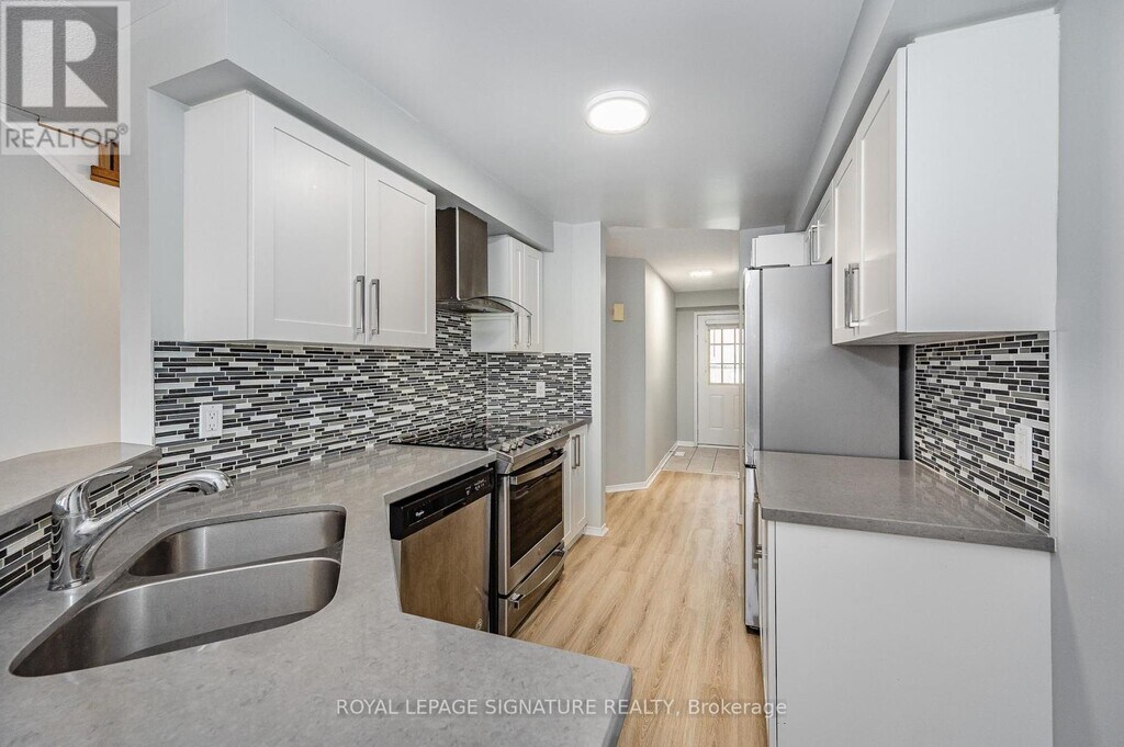Gorgeous 3-bedroom,2-bathroom townhouse in the highly desirable Hurontario neighbourhood. Step inside to an inviting open-concept layout featuring a modern white kitchen with stainless steel appliances and a bright living area overlooking the beautifully fenced-in backyard-perfect for entertaining. Upstairs,you'll find three spacious bedrooms filled with natural light. The impressive primary bedroom offers his-and-hers closets and direct access to the semi-ensuite3-piece bathroom. The lower level features a functional recreation room with a walk-out to your private,peaceful yard. This home also includes two parking spaces,including convenient garage parking. Located close to restaurants,schools,shopping,highways,and transit-this home truly has it all. (id:52069) ID#: 2162845