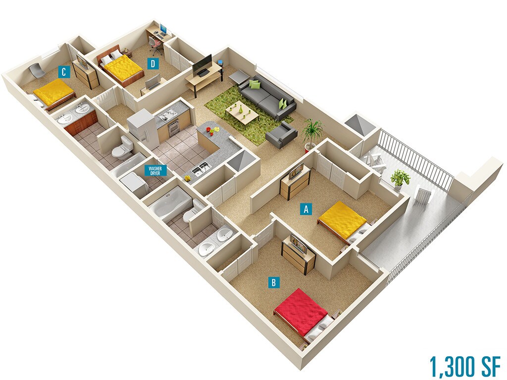 4 Beds, 2 Baths, 450 sq ftModel Gallery