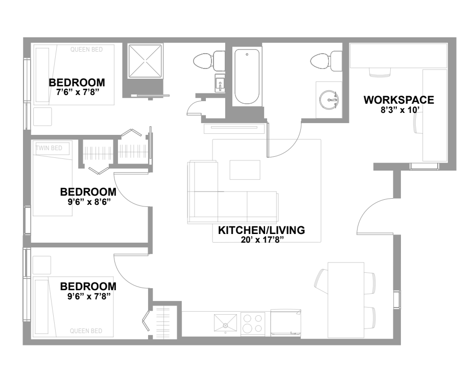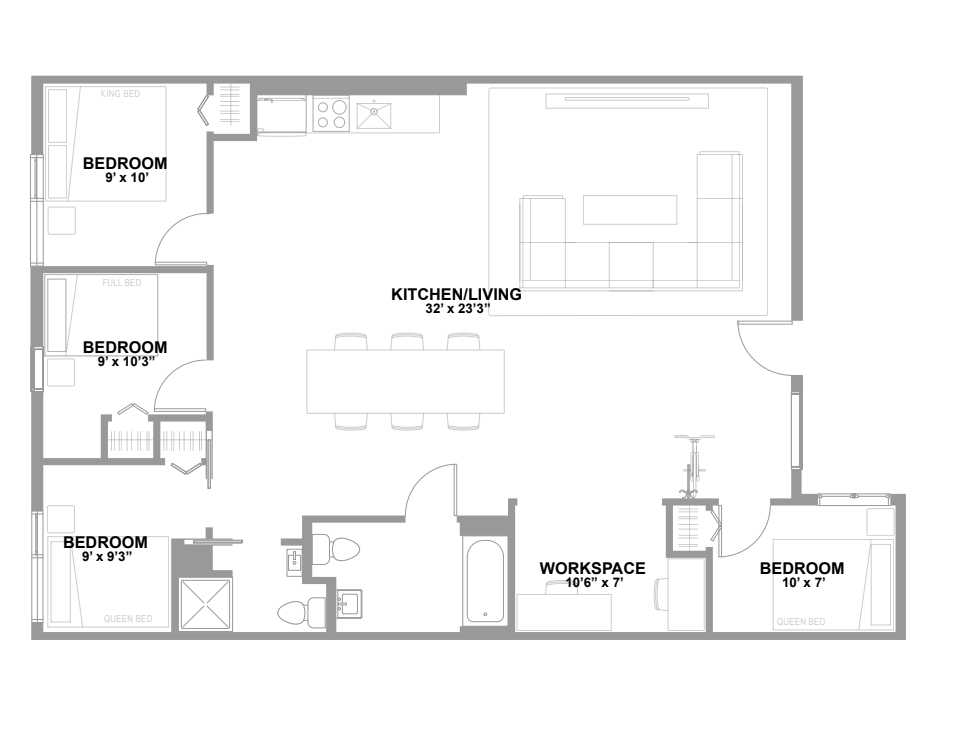Apartment Model: 4 Bed 2 Bath A4 Bedroom, 2 Bath, 1376 sq ftUnavailable![]() - 4 Bed 2 Bath A - Floorplan 1