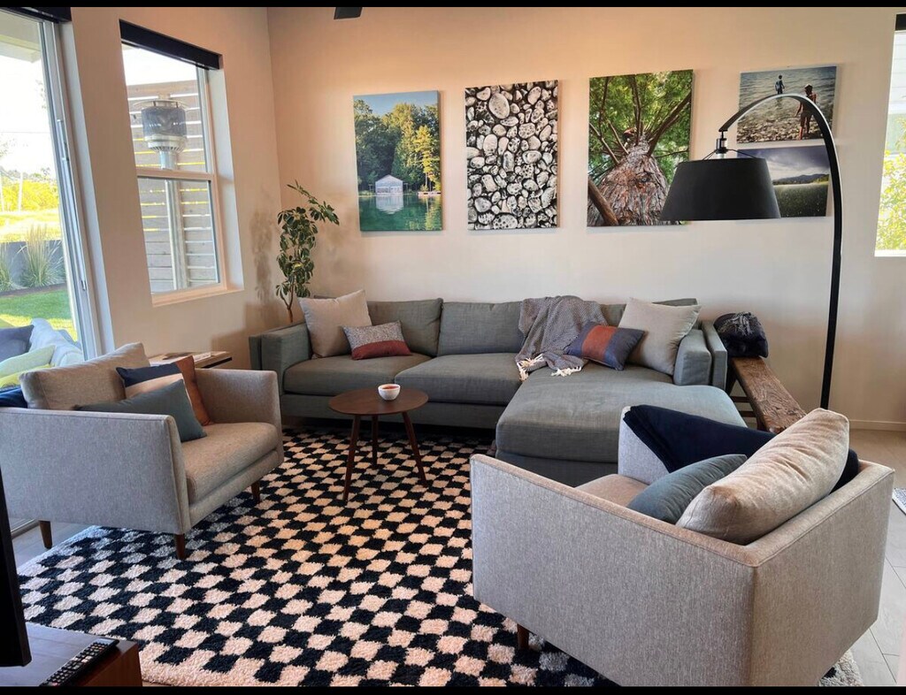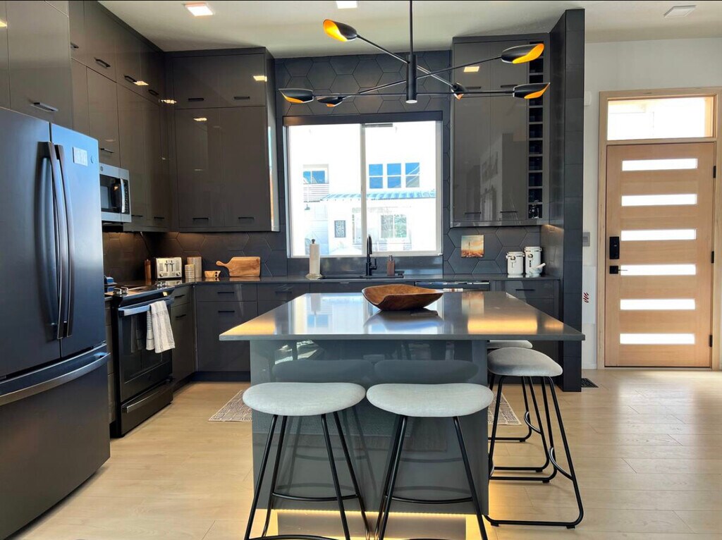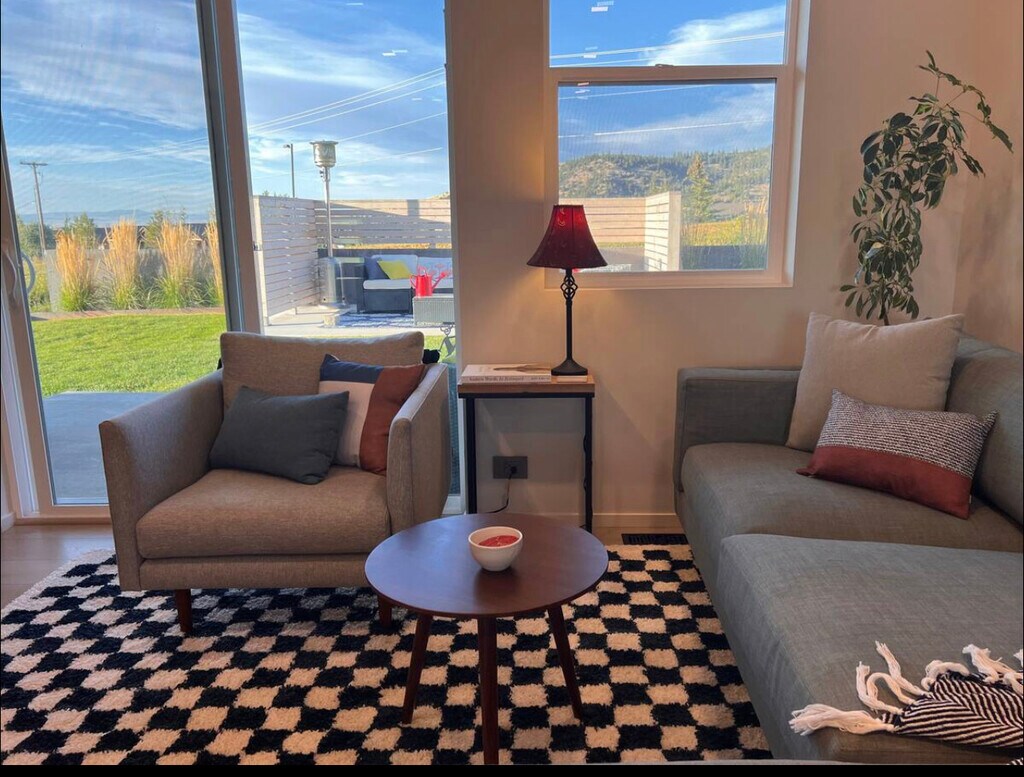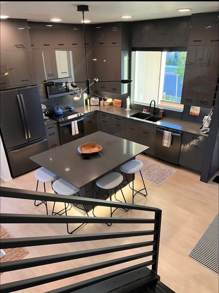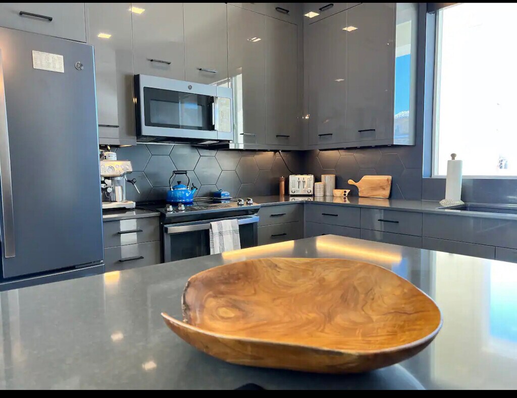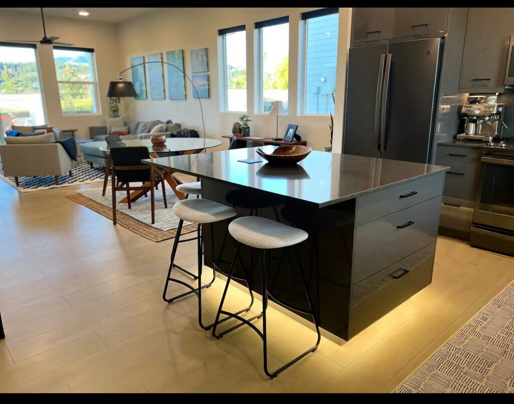 You will love this home! Pull up in the driveway or attached garage, making unloading easy. Enter via code to your modern, immaculate and well thought out home: a fully stocked kitchen, high end appliances, an espresso machine for morning lattes & stylish island seating for 4. Hardwoods throughout, natural light, dining table for 3. Head upstairs to the 2nd floor bedrooms to sleep on quality sheets & linens, enjoy a private deck off the main br + a 3rd br office w/ spectacular mountain views. The space Relax and enjoy the oversized couches, comfy modern chairs + big screen TV in the cozy living room. Head outside to enjoy sunrise/sunsets from the front & back patios, a grill for BBQ nights, and outdoor couches to entertain friends! The spacious modern main bath has a huge walk in tile shower and glass doors with dual heads, plus floor to ceiling mirrors and plenty of drawers for your belongings. Oversized washer/dryer on the 2nd floor. Automatic lighting as you enter the bathrooms, surround sound speakers, storage in the garage.. this almost brand new home has a truly fresh, modern feel! Sleep like a Queen (or king)! Motorized blackout shades throughout, modern fixtures, bedroom ceiling fans, auto lighting upon bathroom entry, all makes you feel seen! Keyless entry, TVs offer Hulu, Apple TV, etc. and enjoy the Nest thermostat. This home ensures you will feel cozy, safe, and peaceful. Running trails out your door, blocks from the hospital, bike to downtown in 10 minutes! Healthy living at its finest!