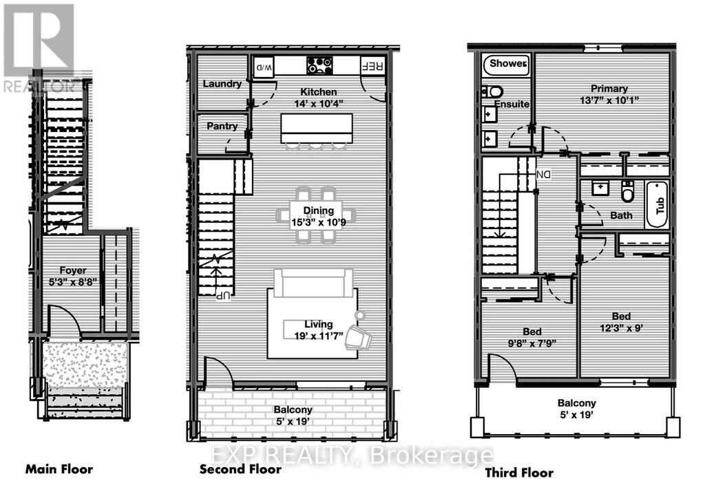 Brand-new executive Two Storey 3 bed 2 bath Apartment for rent in the heart of Wellington Village offering over 1,250 sq. ft. of beautifully designed living space. Enter a spacious tiled foyer with large closet. Wide stairs lead to the second level which boasts an open-concept kitchen,living and dining area flooded with natural light,complete with a large centre island,quartz countertops,stainless steel appliances,a walk-in pantry,laundry,and access to an impressive 5' x 19' private balcony. The third floor offers a generous primary suite with double closets and an ensuite bath with tile shower,plus two additional bedrooms and a full bathroom. Another 5' x 19' covered balcony off the third bedroom. Ideally located steps to Fisher Park and Elmdale Public School,minutes to the shops and restaurants along Wellington Street West,walking distance to the Tunney's Pasture O-train station,with quick access via the Harmer Avenue Footbridge to the Civic Hospital and the Experimental Farm,and easy Highway 417 access for seamless commuting-an exceptional opportunity to enjoy modern living in one of Ottawa's most sought-after neighbourhoods. (id:52069) ID#: 1893553
