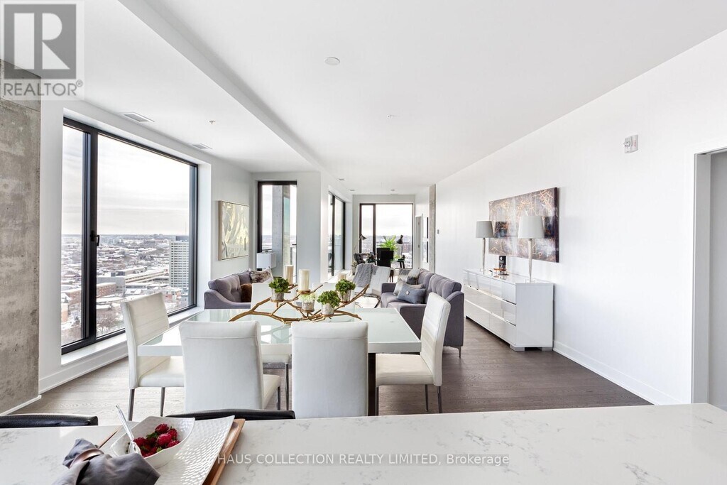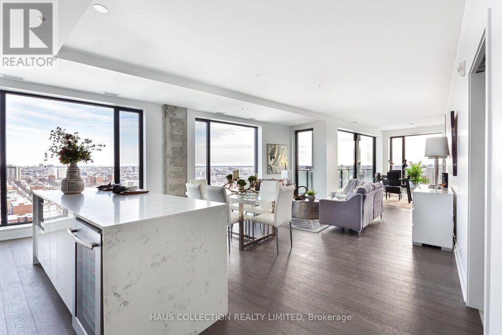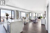 Penthouse 2305 at ArtHaus is a rare offering that elevates downtown living in every sense. This 2-bedroom,2-bathroom corner suite boasts soaring 10-foot smooth ceilings,expansive portrait windows with sweeping views to the east and south of Ottawa,and a covered balcony for quiet outdoor moments. Inside,you'll find premium upgrades throughout: oak hardwood floors,custom window sheers,remote-controlled blackout curtains in both bedrooms,and a generous foyer with built-in storage. The kitchen is a showpiece featuring integrated JennAir appliances (including built-in fridge and wine cooler),quartz waterfall island,designer light fixtures,and exceptional storage. The open-concept layout flows seamlessly into the living and dining areas,bathed in natural light. The primary bedroom includes a walk-in closet with custom cabinetry and an elegant ensuite with rainfall shower and wand. A full-size washer/dryer and a second bathroom with tub complete this sophisticated residence. ArtHaus is an intimate,boutique residence with only 87 suites. On this exclusive penthouse floor,you're one of just four residences offering unmatched privacy in the heart of downtown. Residents enjoy a private lobby,fitness studio,rooftop terrace with fireplace and BBQs,resident lounge,and is uniquely situated atop the Ottawa Art Gallery and Le Germain Hotel,offering effortless access to downtown Ottawa's cultural and culinary amenities. A truly unique and elevated living experience awaits. Photos shown are of the unit when previously staged. (id:52069) ID#: 1881995