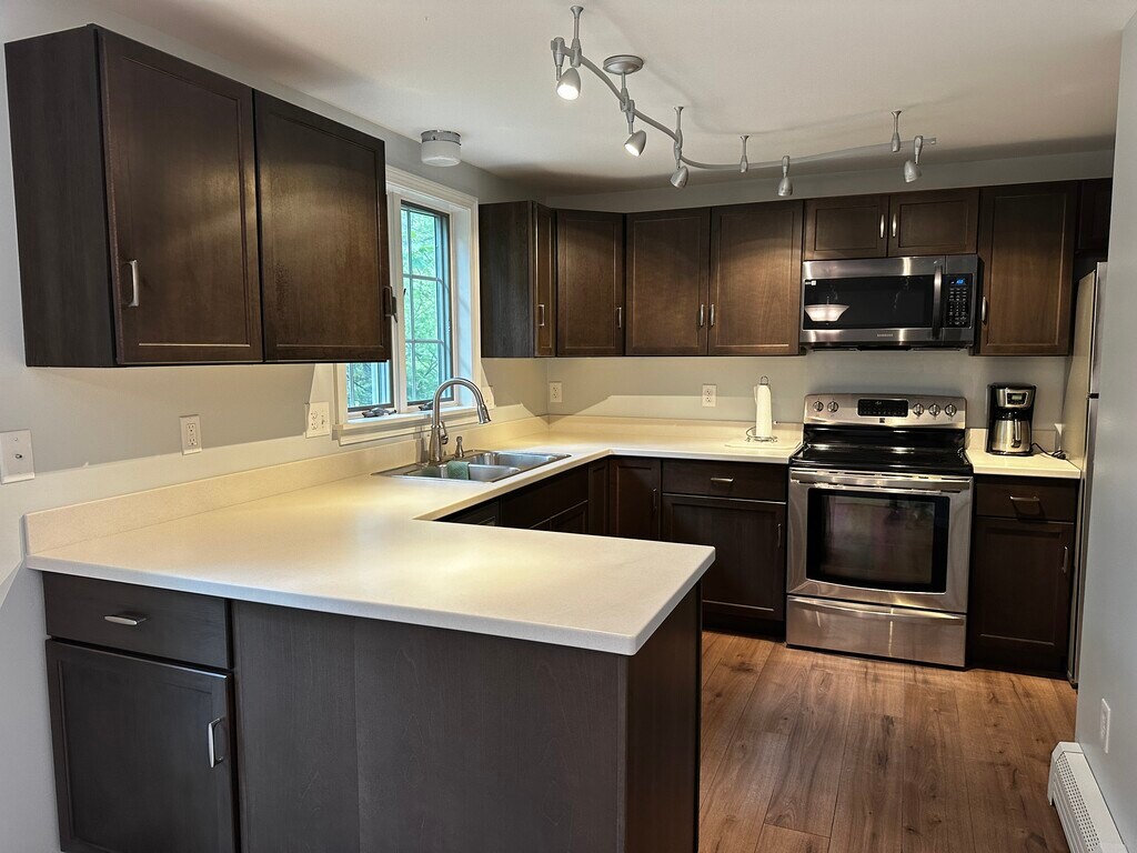 This end unit condo at 20 Neal Road in Windham has 1088 square feet, 2 bedroom and 1.5 bath in a beautifully landscaped condo association available for long term lease. The unit comes with 2 parking spaces, loft above master bedroom, private deck, stainless steel appliances including microwave, new cabinets, modern faucet, updated bathrooms, and washer and dryer in finished basement with table and storage shelves. The master bedroom has a cathedral ceiling with ceiling fan, which includes a remote. Storage in basement with new washer and dryer. Pet friendly condo association has a condo board comprised of owners. Amenities include swimming pool, picnic/party area, tennis and basketball court, and gardening space available. Condo is located in Windham, ME only 20 minute commute from Portland with ready access to Sebago Lake/ Lakes Region and Mountain Division Trail. Condo is an end unit of a 3 unit building with 2 assigned parking spaces. Outdoor upkeep including mowing, landscaping, plowing and shoveling walkways maintained by condo association. The association property is beautifully landscaped, private with mailboxes in one central location. Owner will continue to pay condo dues. Deck in back of unit is accessible by sliding door off kitchen and private outdoor access where you can grill and have room for table and chairs. There are bird feeder or flower basket hooks attached to deck and one in front. This property is suitable for those seeking a functional living space with essential amenities.