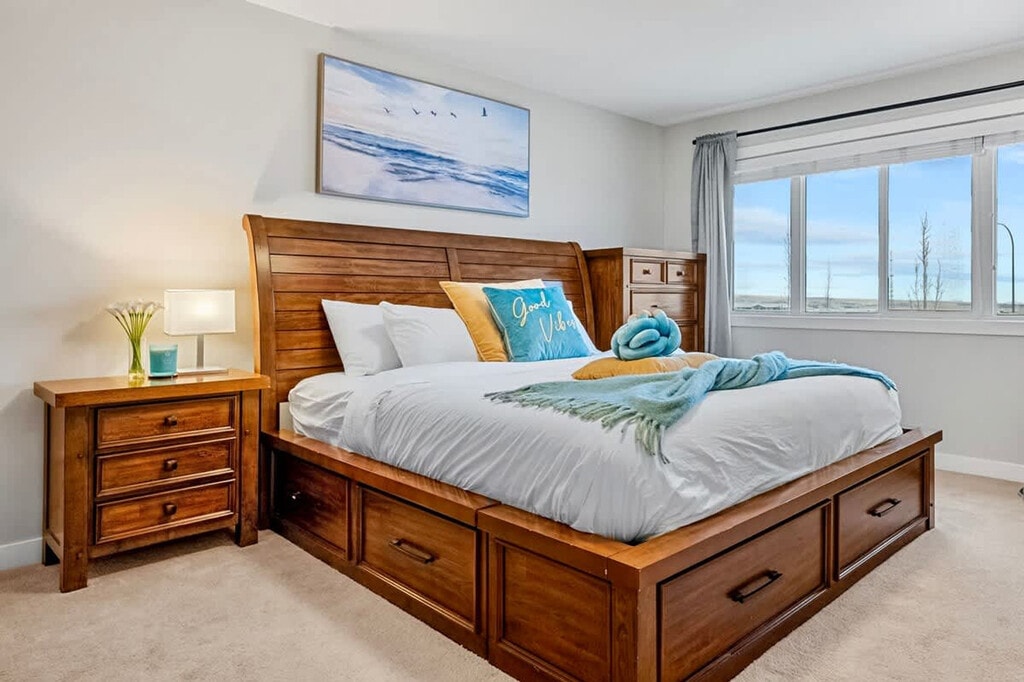 Welcome to The Mask, a spacious 5-bedroom home in NW Calgary. This inviting residence features a king-size bed, double bed, queen bed, bunk bed, and sofa bed, ensuring ample space for everyone. Enjoy two cozy living rooms and family-friendly amenities like kids' dishes, a high chair, and a pack-and-play. The master bedroom and movie room are equipped with room-darkening blinds for ultimate comfort. Relax on the balcony with views of Calgary and park hassle-free in the private driveway, making it perfect for families and groups. The home boasts two full bathrooms with bathtubs and a half bathroom, a fully equipped kitchen with a microwave, stove, oven, and coffee machine, and a dining table that seats six. Entertainment is at your fingertips with an 85" smart TV and a 65" smart TV. Additionally, the property includes a washer and dryer for your convenience. Please note, there is no AC, and the house can get hot in the summer. The property offers private free parking for your convenience. Pets are allowed with a pet fee charged per pet, plus any additional cleaning needed. Conveniently located, you're just a 5-minute drive from restaurants and Costco, a 20-minute drive from downtown Calgary and YYC Airport, and a 15-minute drive from WinSport/COP. For those looking to explore further, Banff is only an hour's drive away. The home is lived in part-time, so there are locked closets and personal touches. A basement tenant has a separate entrance, and there is a locked door on both sides, ensuring privacy. The bunk bed is recommended only for small kids as the mattress is not thick or supportive, and the ladder can be tricky. Smoking is permitted outside, away from windows, but not indoors or near windows, with a $1000 fee for violations. Parties or excessive noise are not allowed, with a $1000 fee for misbehavior. Please remove shoes at the entrance, and note that no overnight guests are allowed without prior approval. Early check-in or late check-out is available for an additional fee, and sticking to the check-out time is essential to avoid extra charges. The use of glitter for celebrations or craft projects is prohibited. The home is equipped with fast Wi-Fi and a dedicated workspace, making it remote work-friendly. Registration Number: BL287725