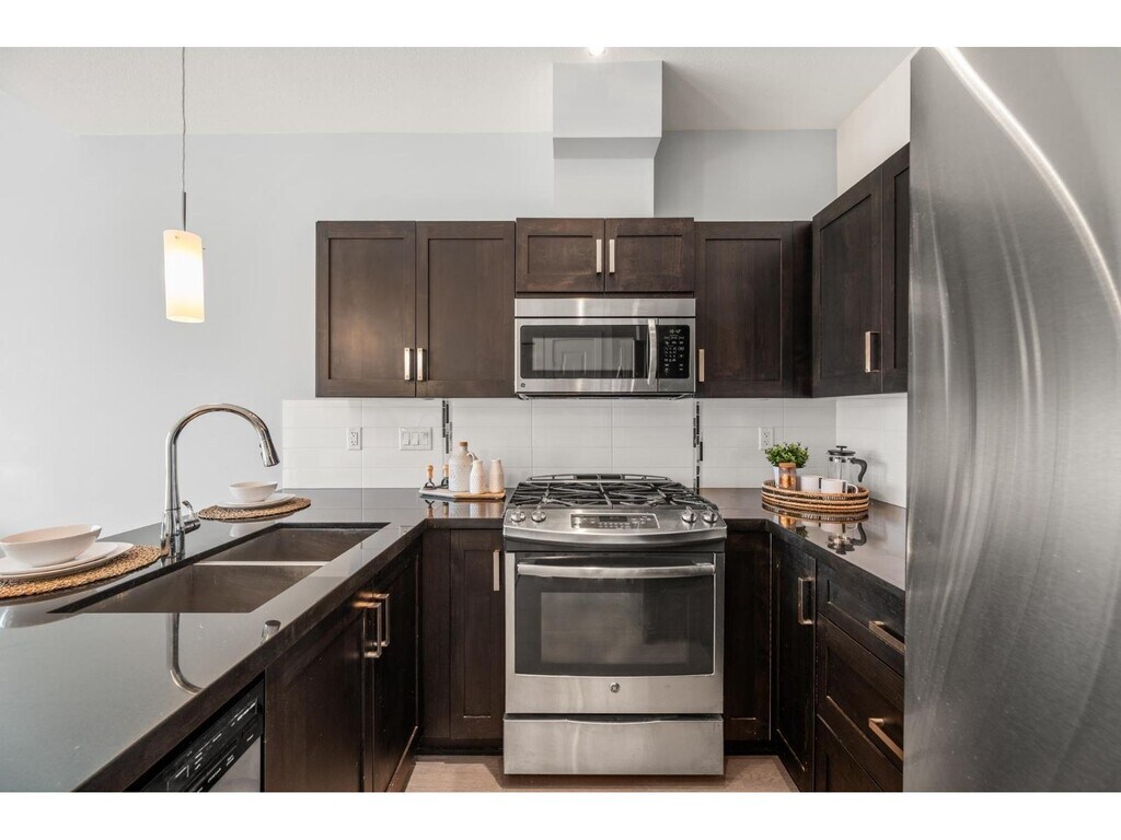 Top-floor 1-bedroom condo ideally located in the heart of Langley City along Fraser Highway,offering exceptional convenience for students,professionals,and commuters. Minutes from Kwantlen Polytechnic University and within easy reach of Trinity Western University,with transit,shopping,dining,and parks nearby. The 503 Express Bus is an 8-minute walk,providing direct access to King George SkyTrain Station. Close to Willowbrook Shopping Centre,Costco,and major retail hubs,plus Nicomekl Trail and local parks. This bright unit features an open-concept layout with high ceilings,large windows,a kitchen with granite countertops,stainless steel appliances,and gas stove. The bedroom includes a walk-through closet to a full ensuite. A multi-use room,private terrace,1 parking stall. (id:63800) ID#: 1483201