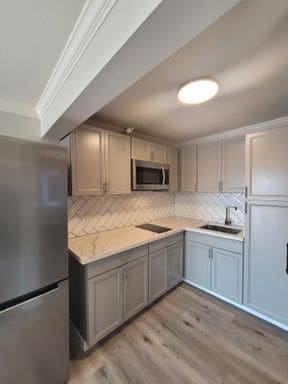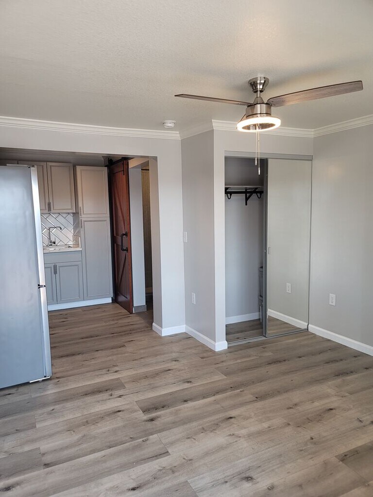 Situated in the heart of Downtown Las Vegas, 2019 Fremont Apartments feature studio and 1-bedroom units of varying layouts and sizes with top-of-the-line modern finishings. This particular unit is a studio with a shower accented by a tall glass door. The unit features elegant knotty alder barn doors, full kitchen with stainless steel appliances, and Bluetooth enabled bathroom mirrors that also feature surround lighting and anti-fog capabilities. The property features automated gate entry, fire sprinkler system, on-site laundry facility, and is completely gated. Tenants can enjoy being a short walk from the happening Downtown scene and a short drive from the bustling Arts & Brewery Districts.