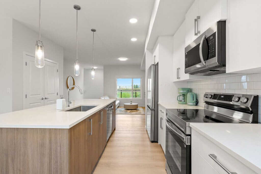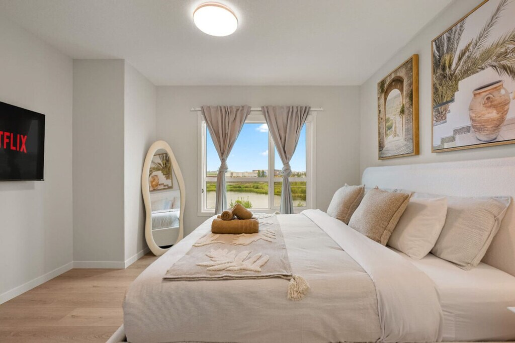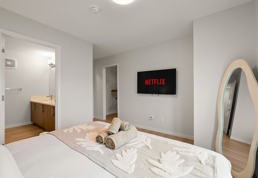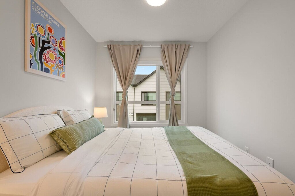 Feel at home in this designer-furnished apartment located in a safe and vibrant community, just steps away from Seton Health Campus, YMCA, dining, and shopping. Enjoy the convenience of a private balcony and easy access to Deerfoot and Stoney Trail. This apartment features a king-size bed with a 50" smart TV and Netflix, two queen beds, and two sofas. The living room is equipped with a 58" smart TV and Netflix, creating a modern and inviting atmosphere. The fully equipped kitchen includes stainless steel and custom appliances, a 4-burner stove, oven, microwave, refrigerator, freezer, and dishwasher. Enjoy complimentary coffee, tea, and a Brita filter. Central AC and heating, a washer and dryer, and fast Wi-Fi (500 Mbps) are also included. The apartment offers free garage parking with additional parking available via street parking and paid visitor parking. Optional upgrades include a National Park Entry, Welcome Basket, Birthday Decor Package, Romantic Wine and Flower Package, Spa at Home Package, Movie Night Upgrade, Christmas Tree and Decor, Halloween Decor and Pumpkin Carving Package, Winter Cozy Package, Beer Tasting Kit, Diffuser and Aroma Set, Additional Bedding and Sleeping Arrangements, Grocery Pre-Stocking Service, and a Pet Friendly Package, subject to availability. Seton is a master-planned community designed for walkability, featuring parks, pathways, and green spaces. Convenient bus services by Calgary Transit connect Seton to key areas, with easy access to major roads like Deerfoot and Stoney Trail for seamless city travel. The apartment is ideally located near Seton Urban District, South Health Campus, Brookfield Residential YMCA, Cineplex Seton and VIP Cinemas, Auburn Bay Lake, Cranston Ridge and Bow River Pathways, McKenzie Towne, Deerfoot Meadows, Chinook Centre, Downtown Calgary, Calgary Zoo, TELUS Spark Science Centre, University of Calgary, Mount Royal University, Calgary International Airport, and Kananaskis Country. The apartment is professionally managed to ensure a smooth and enjoyable stay, offering 24/7 guest support and communication. Full self check-in and check-out are available. A $250 CAD fine will be charged if smoking occurs, with the migration of smoke or smell from the unit. Quiet hours are from 10 pm to 7 am, and noise should be kept under 85db. No parties, drugs, excessive drinking, or loud music are allowed. Events for work or meetings are allowed upon request. Unauthorized late check-out will result in an extra night stay or additional fees. Please remove outdoor shoes while in the home. Be mindful of locking bathroom doors from the outside, as costs associated with locksmiths will be the responsibility of the guest. The use of the mailbox is not included with the property, but a PO box can be arranged prior to arrival for a fee. If items are left behind after a stay, the guest will need to arrange with the host to collect them within 14 days of checkout, with a fee for shipping if required. Guests are responsible for any damage to linens, towels, utilities, or equipment upon check-out, and fees will be claimed through the booking platform. False claims and reviews are not tolerated and may lead to serious consequences. Guests are responsible for any plumbing issues resulting from food or debris down sinks. Tampering with safety devices will result in warnings and potential eviction. Children must be supervised on the balcony. Guests will be charged for lost keys or fobs. Unauthorized late check-out will result in additional fees. The apartment is equipped with fast Wi-Fi (500 Mbps) and a dining table, kitchen island seating, and bar stools, providing a comfortable space for remote work.