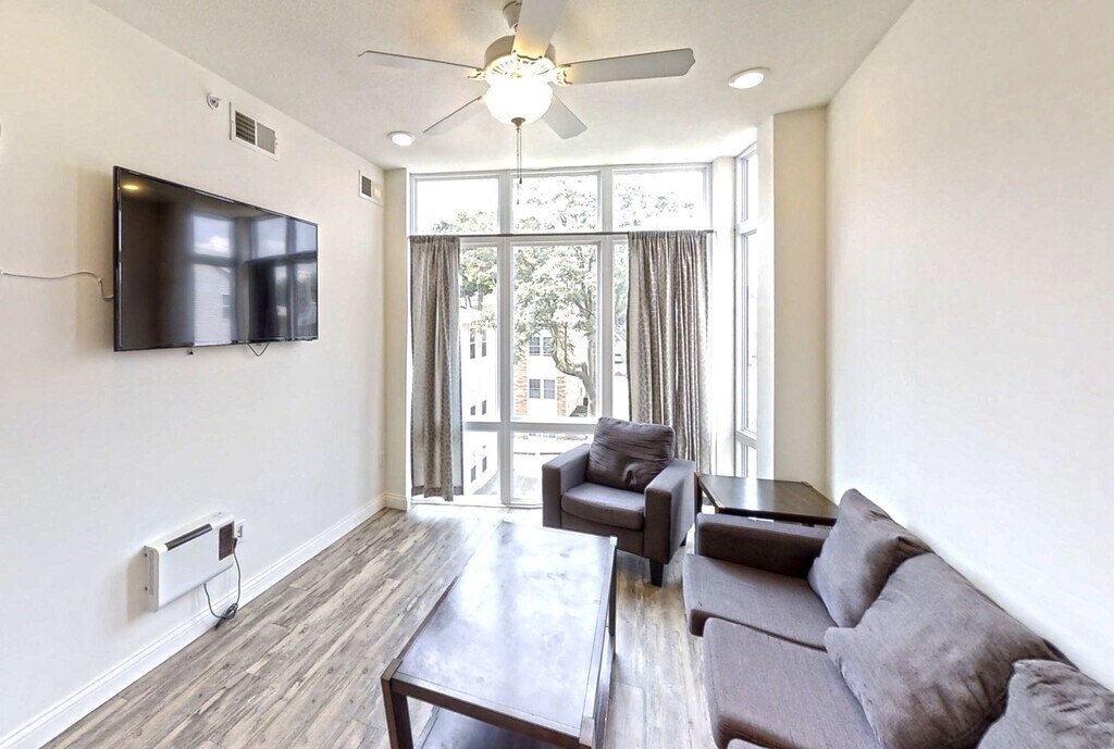 Built in 2015 Water included in rent Short Walk to County Market Secure Video Entry System Chocolate Cabinets and Granite Counter Tops Stainless Steel Appliances In-Unit Washer and Dryer Large Windows and Lots of Natural Light Large Balconies on Most Units TV in Living Room Fully Furnished with Modern Furniture High-Speed Fiber Internet Luxury 2 and 3 Bedroom 2-Story Penthouse Full-Size Beds Elevator Covered Parking Available