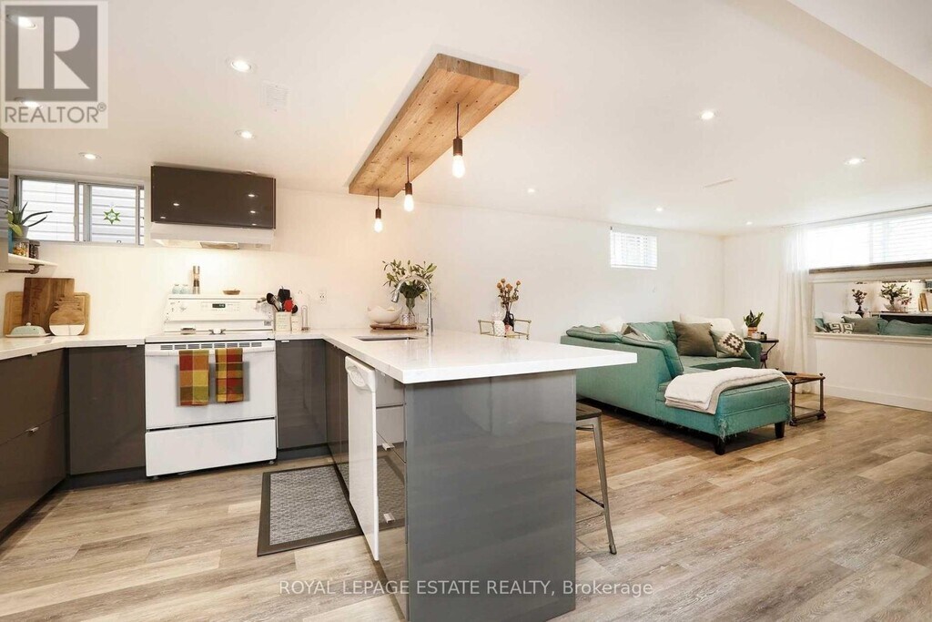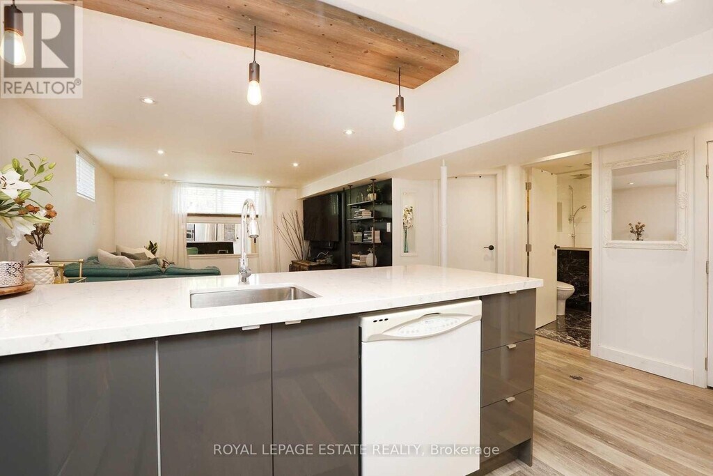 Beautifully renovated two-bedroom basement apartment located on a quiet residential street just north of Kingston Road. This well-finished space offers modern upgrades,clean design,and practical living in a convenient Scarborough location.The apartment features pot lights throughout,keeping the space bright and comfortable. The kitchen has been updated with new cabinetry,quartz countertops,and a custom light fixture that adds character without feeling overdone. The bathroom is a standout,finished with heated marble floors,granite countertops,double sinks,and a glass walk-in shower.Everyday amenities including shops,cafés,restaurants,grocery stores,and services are close by along Kingston Road. Nearby parks and green spaces provide options for walking,jogging,or cycling,with Scarborough Bluffs parks and waterfront trails easily accessible by bike or short drive.Transit is convenient with TTC bus routes along Kingston Road,offering straightforward connections to subway stations and the rest of the city. The area is established and residential,with access to schools,community centres,and recreational facilities. Shared laundry facilities included. Kitchen equipped with refrigerator,stove,microwave,and dishwasher. Utilities are included; tenant is responsible for internet,phone,and cable services if desired. Unit features built-in shelving,all existing electric light fixtures,heated marble bathroom floors,and granite bathroom countertops. Tenant has use of the backyard and BBQ. Separate entrance provided. Short-term rentals,including Airbnb,are strictly prohibited.Photos are from when the unit was previously occupied. (id:52069) ID#: 1761826